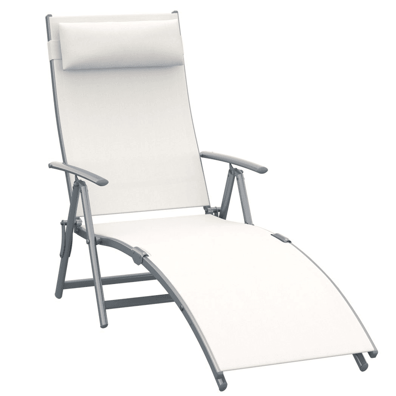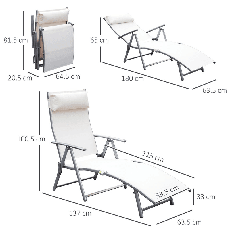 HEAVY-DUTY LOUNGER: Heavy-duty garden sun lounger chair is ideal for outdoor relaxing lounging in patio, beach, park, deck, pool and backyard. STABLE & DURABLE: Made from steel tubing and 560g/m2 texteline material in excellent craftsmanship, strong design with solid steel frame, the garden recliner can hold up to 165kgADJUSTABLE & COMFORTABLE: 5 Level adjustable backrest of outdoor recliner chair to support back for best position, a pillow filled with thick PP cotton for added comfort. FOLDABLE & PORTABLE: The reclining sun lounger can be folded in seconds and transport with lightweight design for easy remove and quick storage when not in use. Upright Size: 137L x 63.5W x 100.5H cm, Foldable Size: 81.5L x 20.5W x 64.5H cm. Assembly Required.