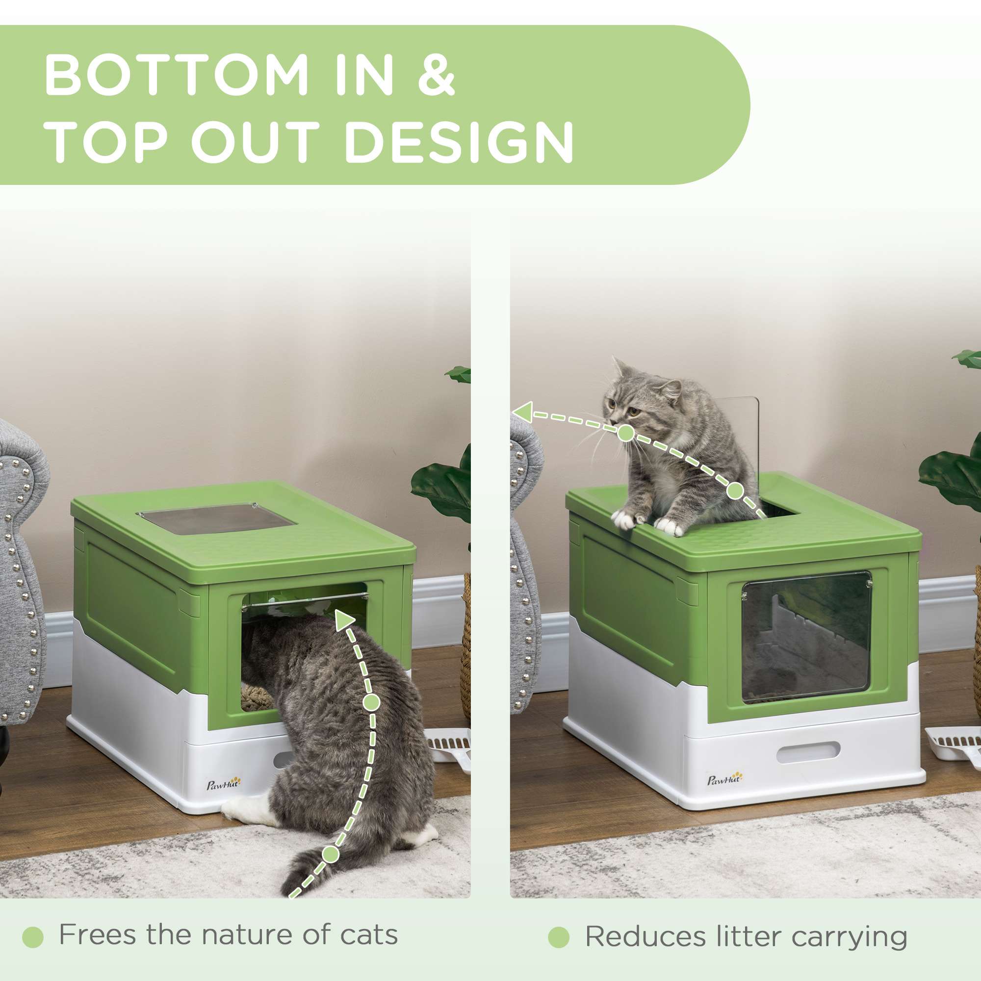 ● Cats will enter the hooded cat litter box through the front door and come out the top, so they don’t carry litter out with them