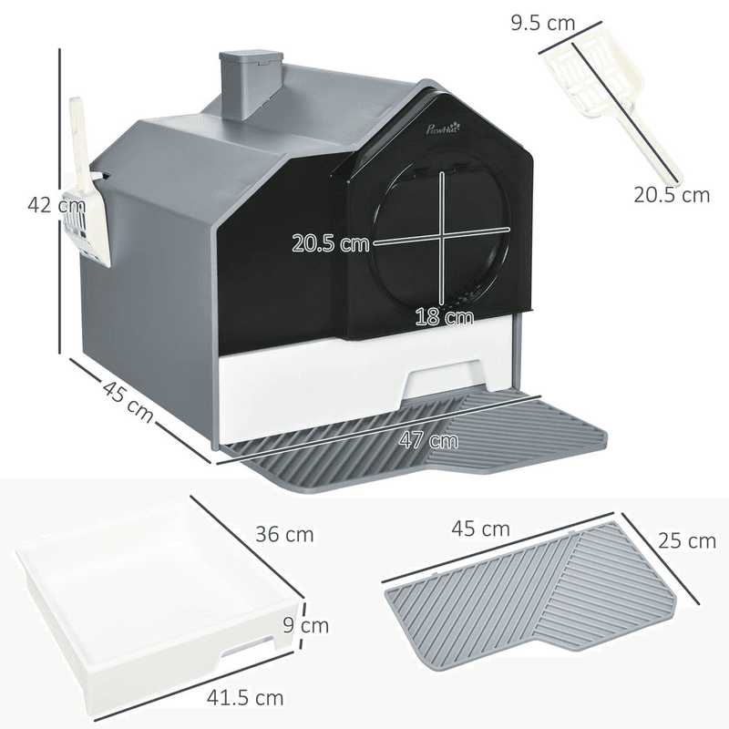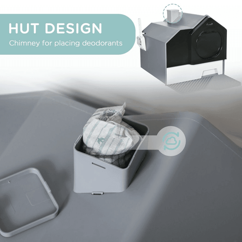 Easy to clean: A scoop is included to clean the cat litter box. Pull the tray at the bottom and maintain the inside. Place the scoop on the outer hood so you don’t lose it.