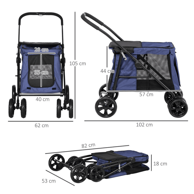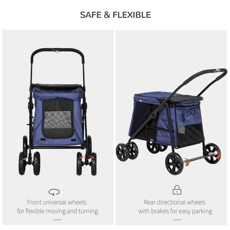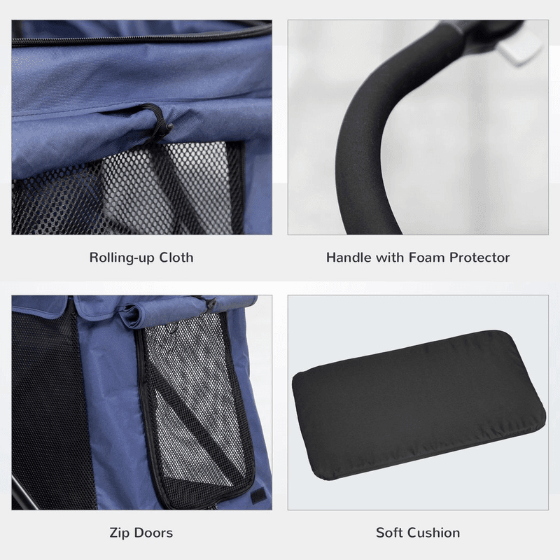 – Four wheels: Includes brakes on two rear wheels for extra safety, whilst the two 360° front wheels are universal, providing smooth and easy movement when pushing this dog stroller.
