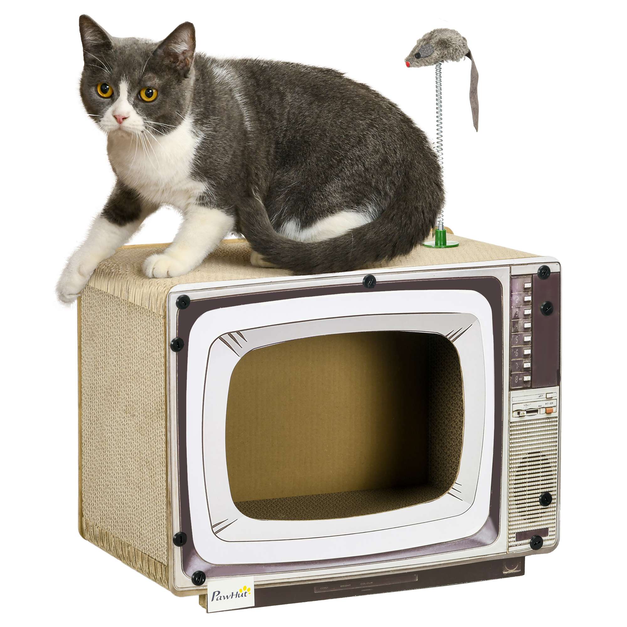 – A two-in-one design, it’s a cat house and a cat scratching board