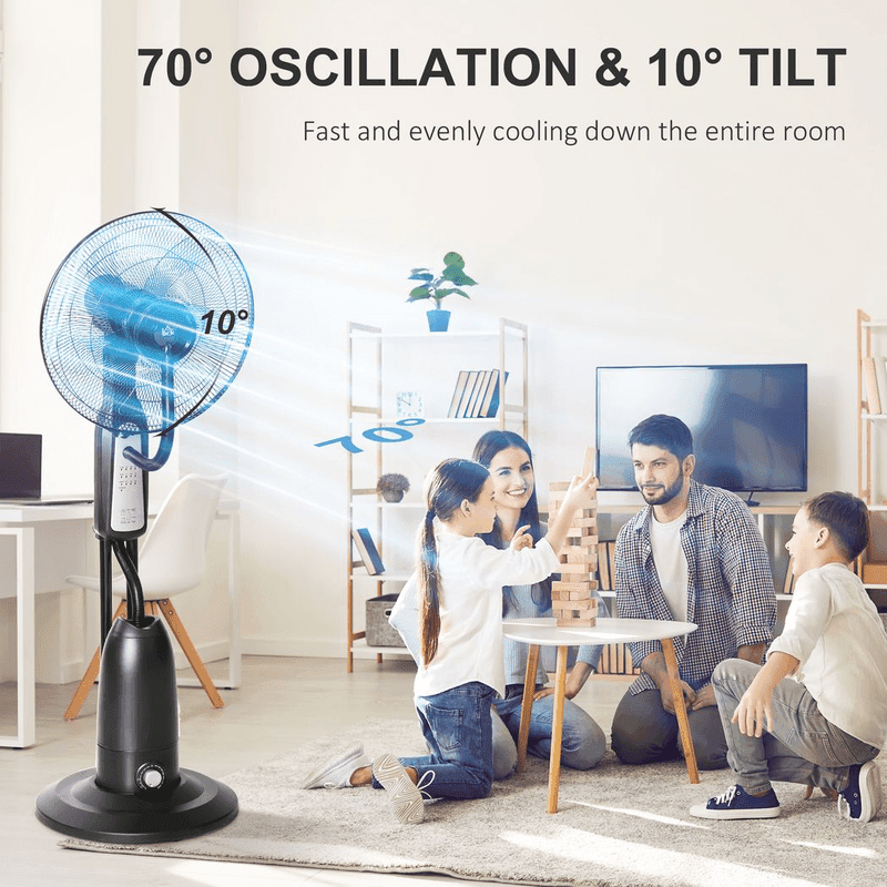 – 70° oscillation and 10° tilt: Floor fan with mist function can be set to move to an area you want, covering larger areas when required.