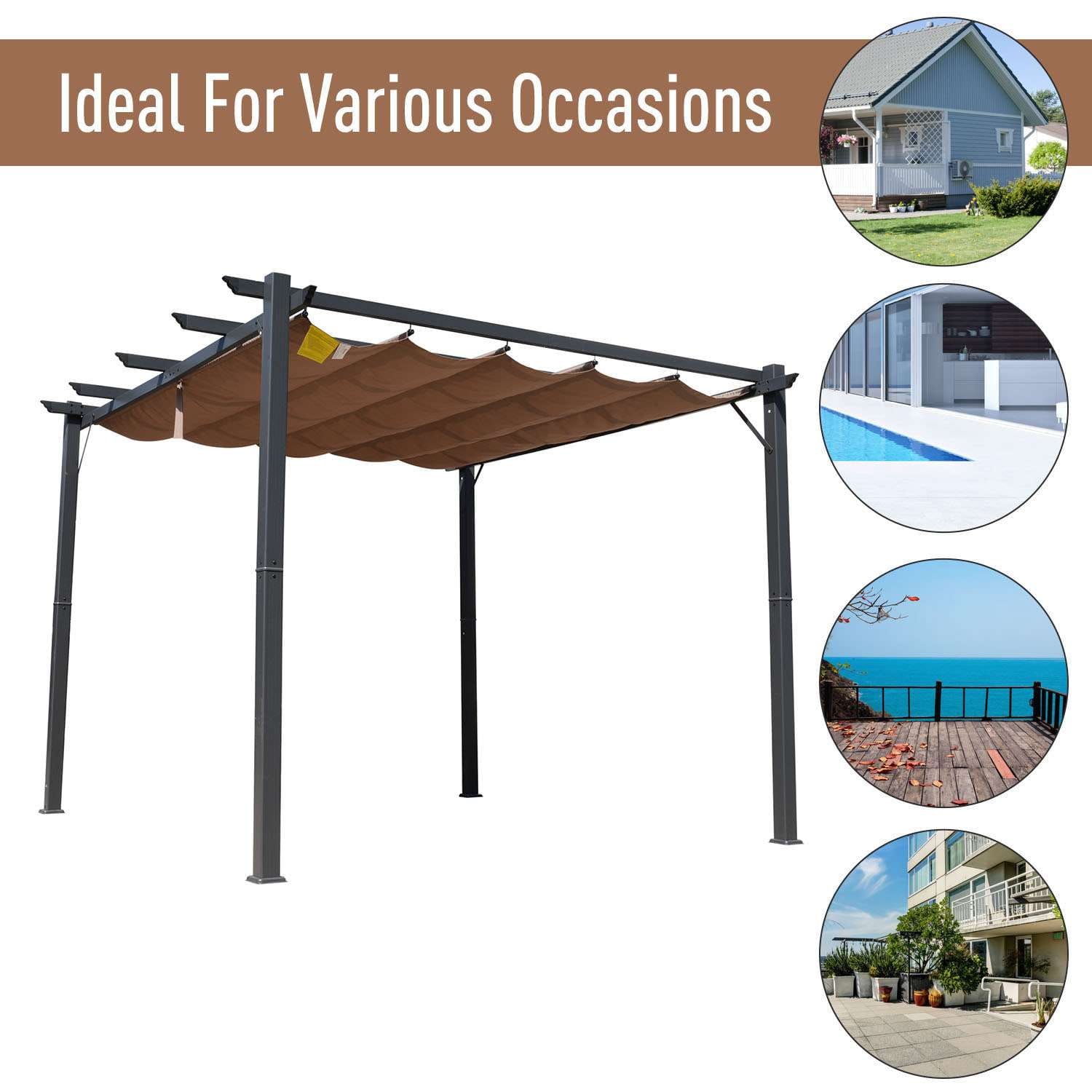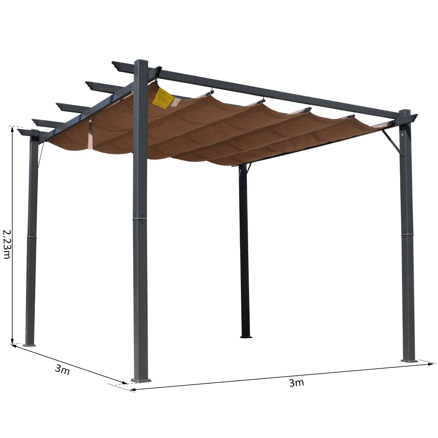Create a shady and cool spot in the garden with this 3m x 3m premium pergola gazebo form Outsunny, which will add a decorative touch to your patio or garden. A perfect accompaniment to any party, barbecue or social gathering, the adjustable canopy is crafted with brown polyester fabric, to keep guests sheltered. Supported with strong powder coated aluminium frame and steel top bars, feet and connectors on the aluminium frame, this highly durable pergola gazebo will provide long lasting use.