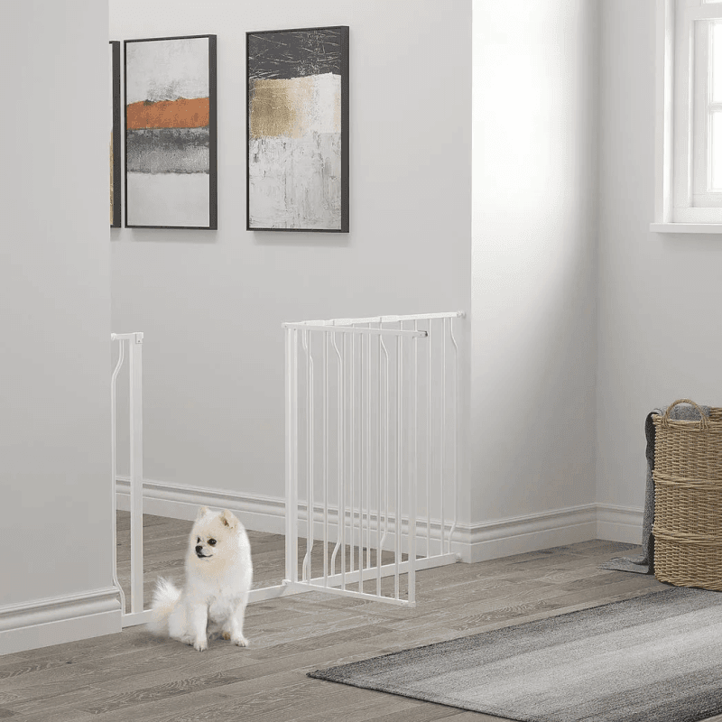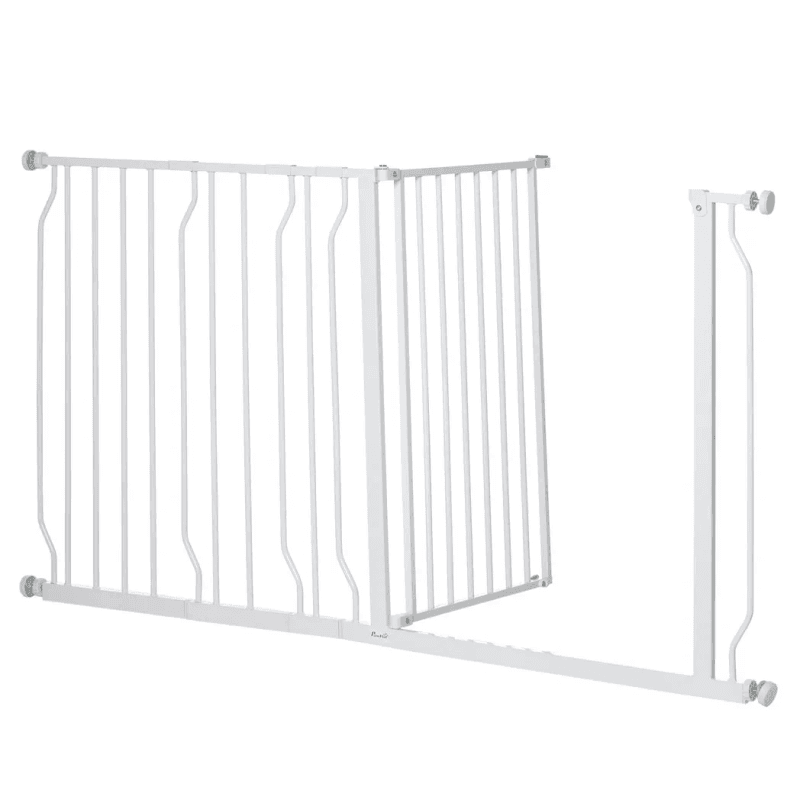Durable material: Made from sturdy steel, this puppy gate is strong and stays firmly upright when in use.