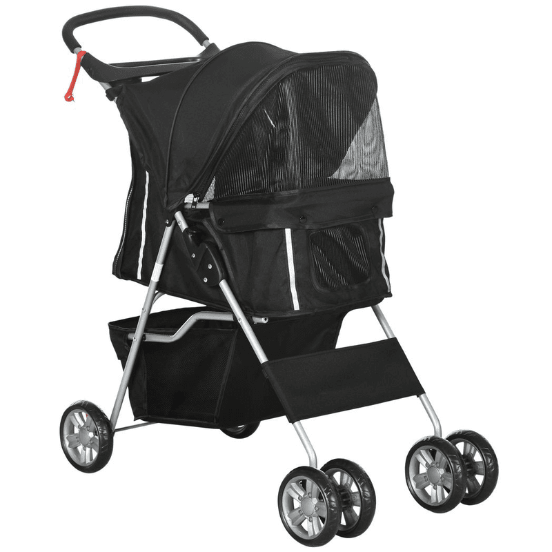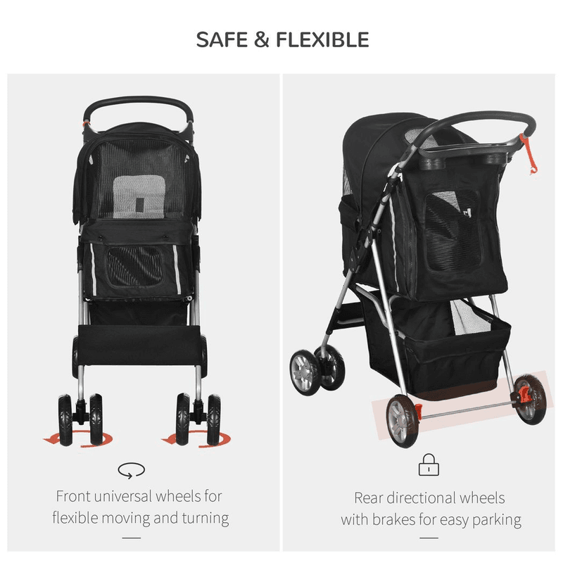 Safety first: Front universal wheels, and rear directional wheels with brake lever included for easy parking, as well as a safety leash inside to keep your pet securely strapped in. 2 pairs of reflective strips on the front and back of the dog pushchair to attract attention.
