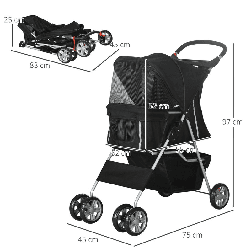Overall dimension: 75L x 45W x 97Hcm, Inner space size: 55L x 32W x 52Hcm. Folded dimension: 83L x 45W x 25Hcm. Suitable for small and miniature dogs less than 35cm in length and less than 10kg in weight.