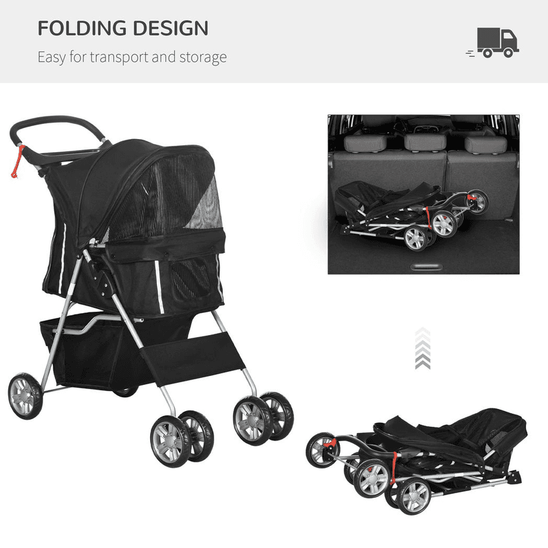 Easy storage & transport: The frame of this cat stroller has a folding design, which means it’s easy to store when not needed, and perfect for traveling by car.