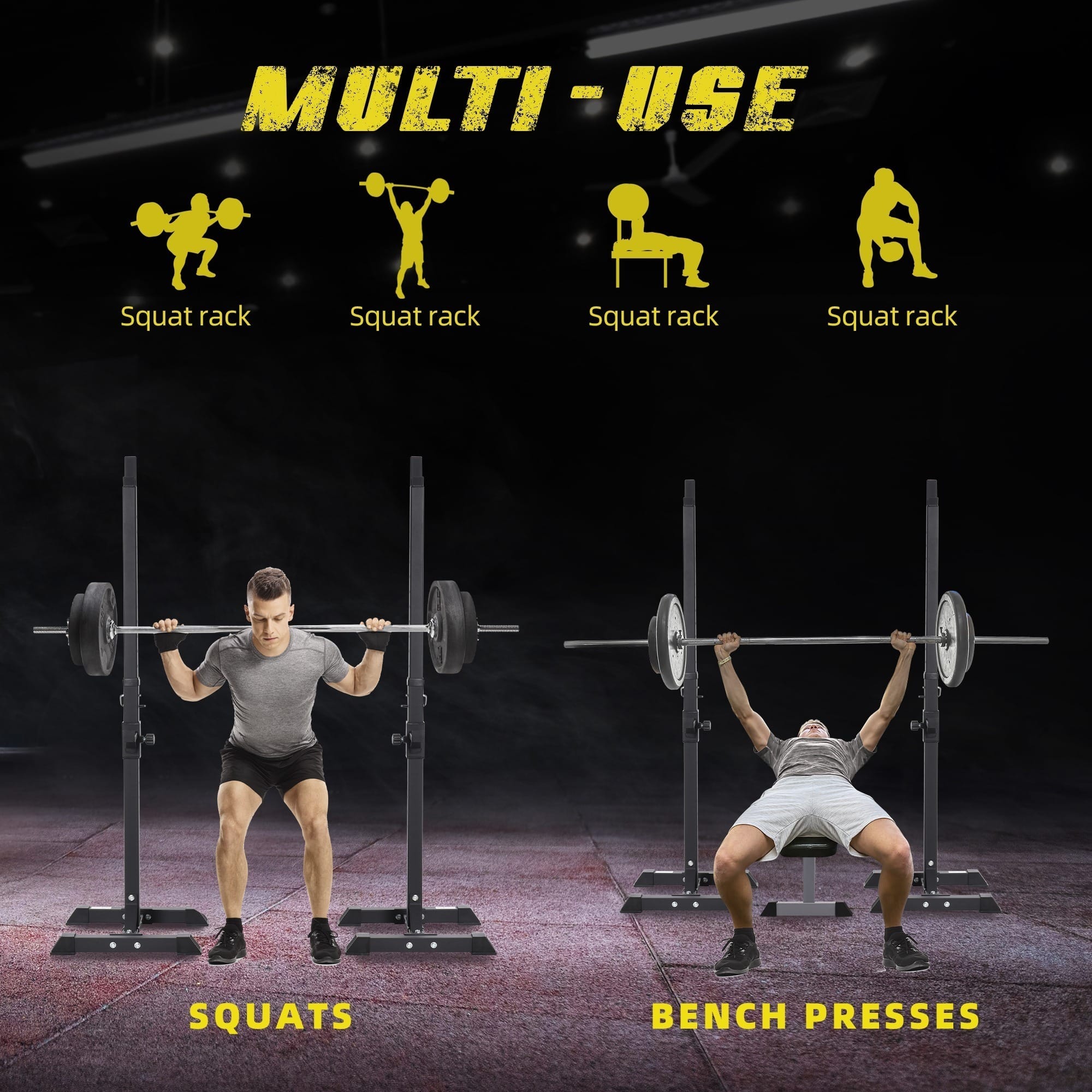 MULTI-USE: The bench press can be used as a squat rack, barbell rack, bench press, squat, dumbbell rack, etc., easy to use and save space. ANTI-SKID: The power rack with specially designed non-slip rubber boots keep the squat stand in place at all times, and protect your floor from scratches. This Barbell squat stand allows you to safely perform various exercises including bench press, shoulder press, squat, dip, overhead lifts and more.
