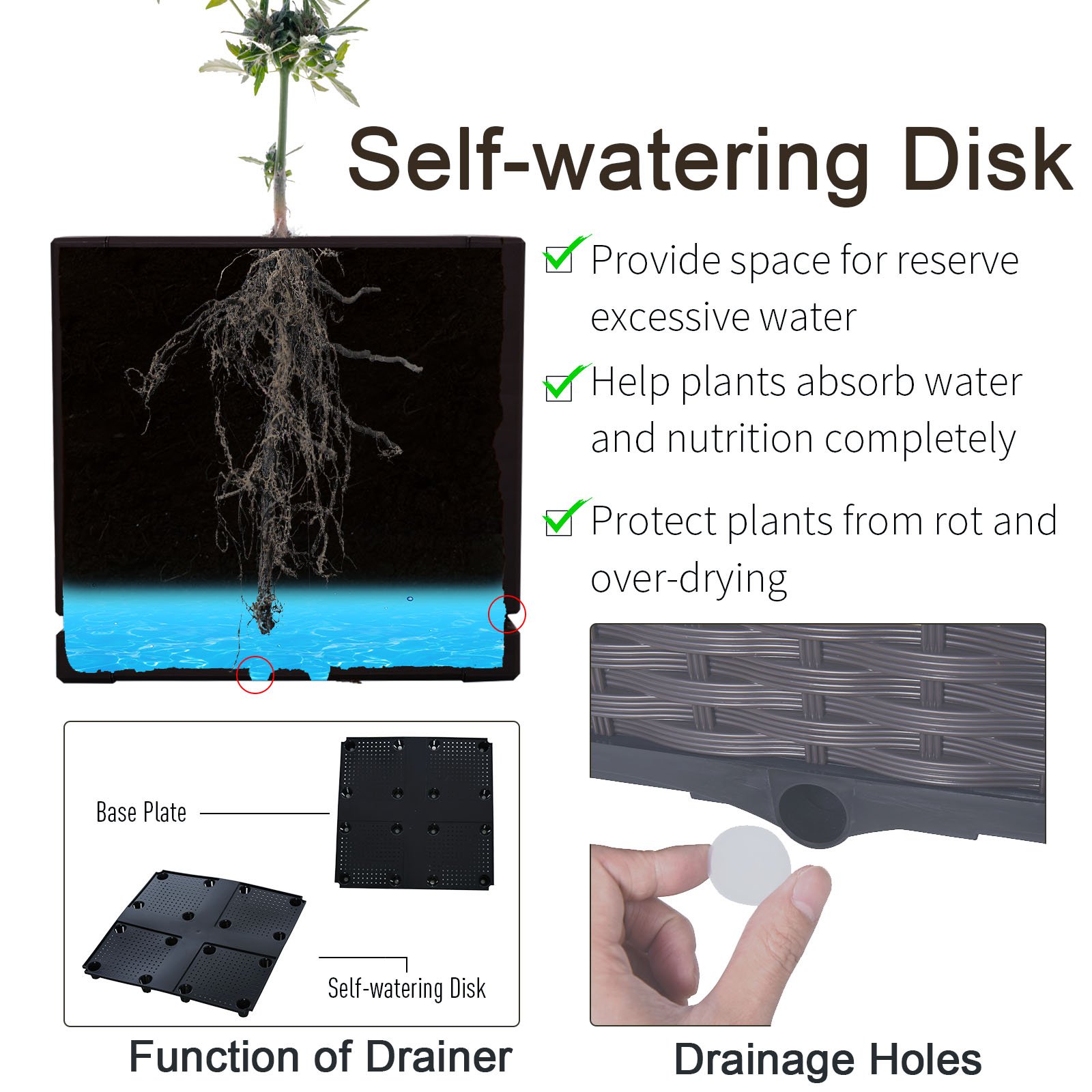 – Intelligent water disc reserves and feeds plants without drowning them, with drainage holes for excess.