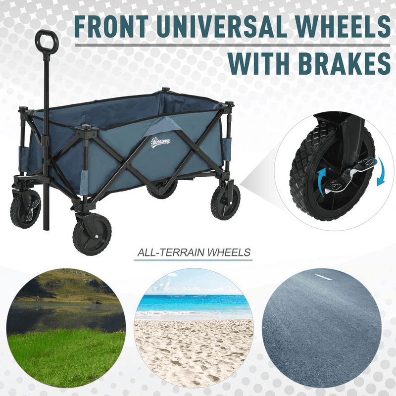 FOUR MULTI-GROUND WHEELS: Two of which rotate 360 to prevent camping trolley getting stuck whilst pulling, all wheels can move easily and smoothly. The front two universal wheels with brake guarantee the safety of garden trolley.