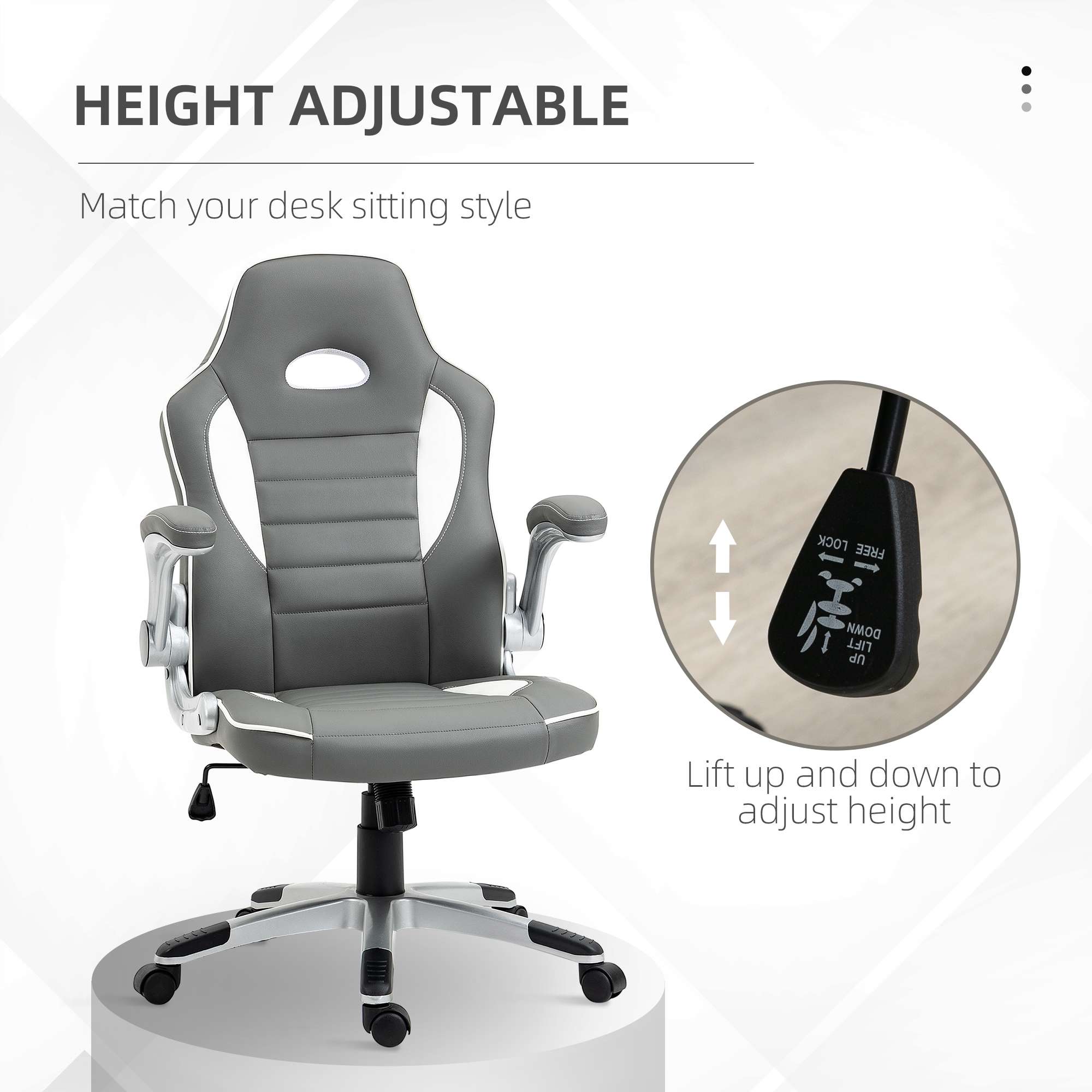 – Flip-up armrests and high back for support. Slots under desk easy when arms are up