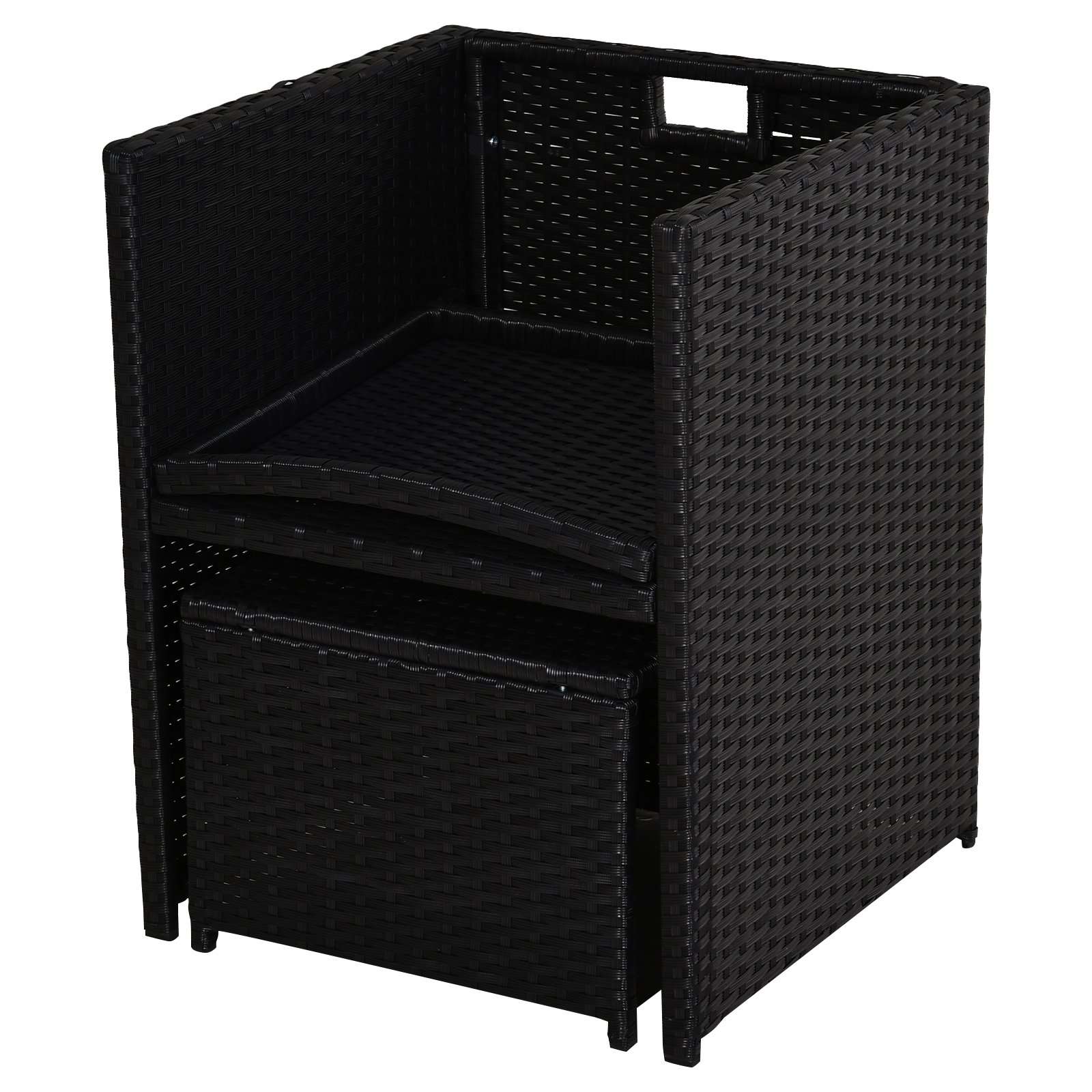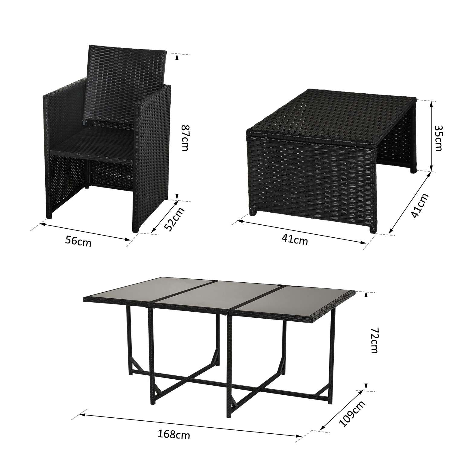 This Outsunny brand rattan set has 6 chairs & 4 footstools which fit neatly under the glass top table to form a cube and each chair has a flip up, reclined back rest to provide far superior comfort. He set is made of a metal structure covered in PE rattan, the set comes with cushions for both the seating and the backrest. Cushion cover is removable and washable to give you a new look every time, and cleaning of the rattan can be done using a damp cloth. The table top is assembled and come complete with a 5mm tempered glass. An anti-UV explosion-proof membrane can withstand temperatures up to 80 degrees Celsius. The film is firmly bonded to the glass and can be used for 2 years. When the glass breaks, the fragments do not fall off the film.