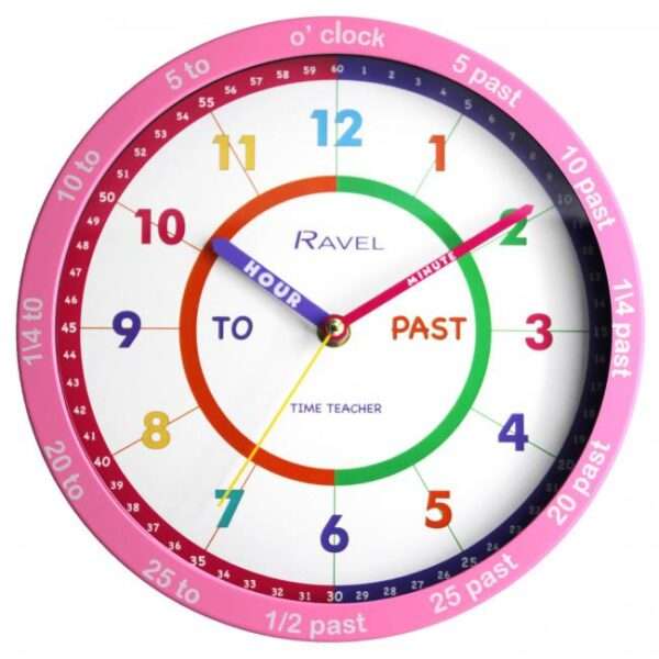 Ravel’s high quality white plastic time-teacher clock is perfect to help you teach your child the time. Clearly labelled, colour coded “to” and “past” sections, hands and numbers help your child learn how to tell the time correctly. Ravel’s fabulous multi-coloured clock is sure to make helping your little one to tell the time a wonderful experience.