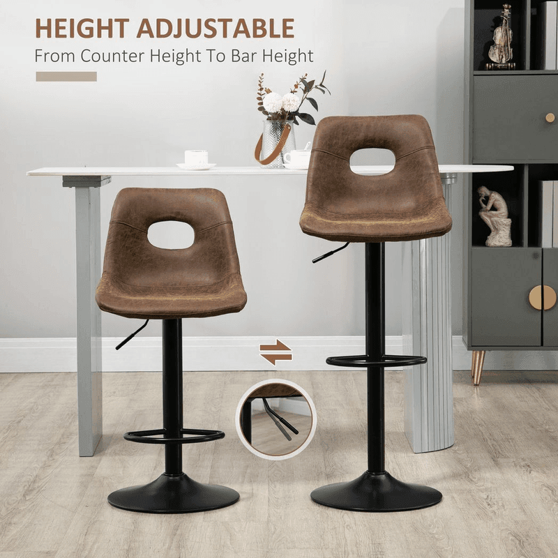 Comfortable: Gently curved seats, with padding. These breakfast bar stools are wrapped in leather-like fabric which is soft to-the-touch. Metal frames: Support as you sit, with rounded bases for balance. Bottom bar is a handy footrest.
