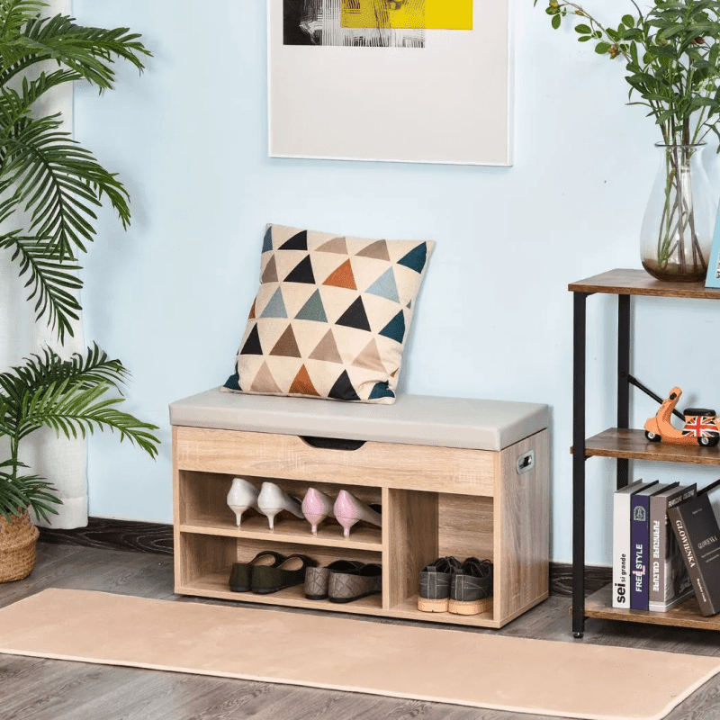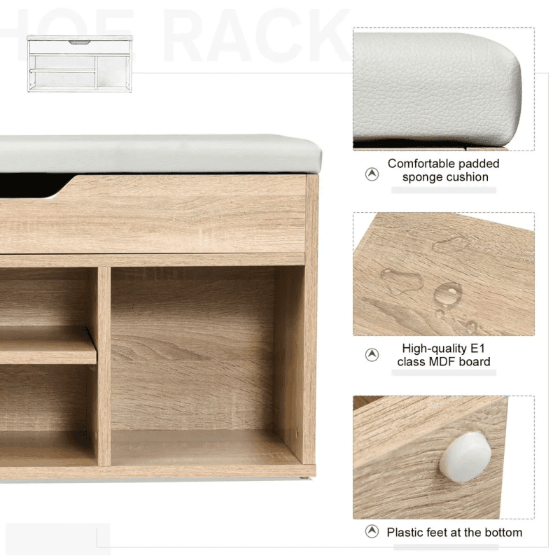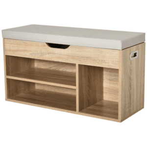 MDF frame: Durable and reliable structure for everyday use. Finished in an oak wood effect for beauty. Bottom plastic feet protect floor. Side handles for easy movement. Padded top: Filled with foam, it ensures you’ll be sitting comfortably – perfect for when putting shoes on.