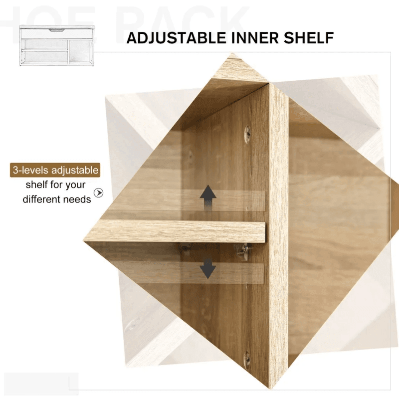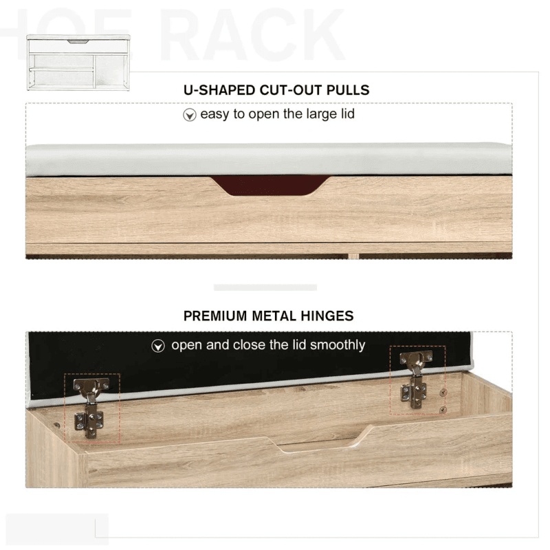 Open storage: Keeps shoes within easy reach, features three compartments for organization. Small concealed top area, with a cut-out handle for safe opening and closing. Left hand shelf can be moved up/down.