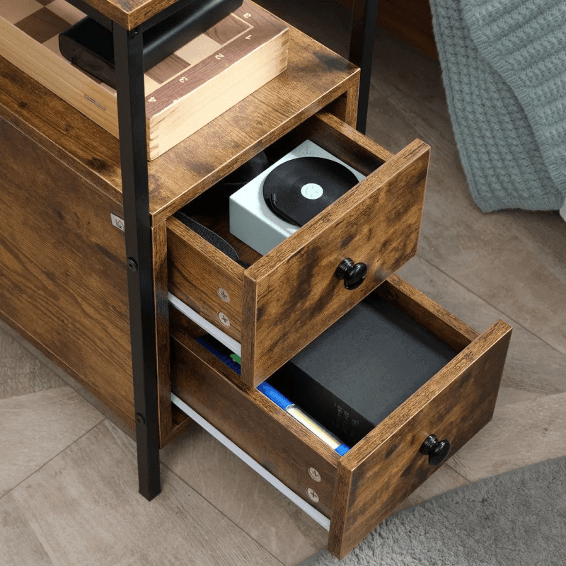 Side table with storage: Generous amount of space for keeping your home clean and tidy, formed of two bottom drawers, a middle shelf and top shelf – ideal for the bedtime essentials.