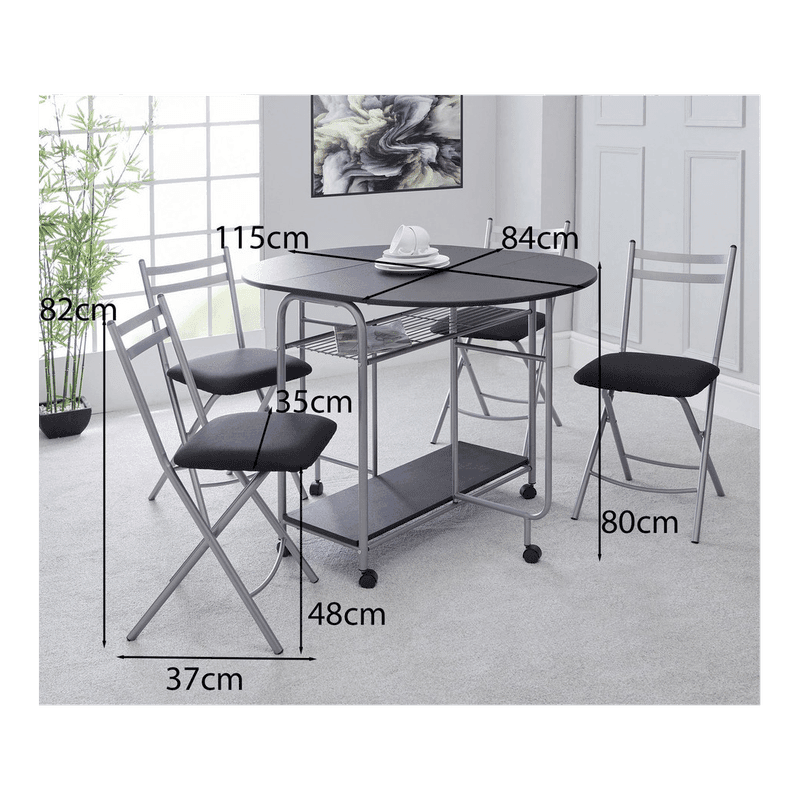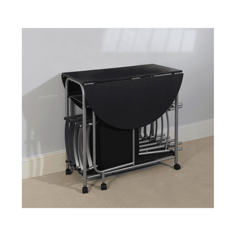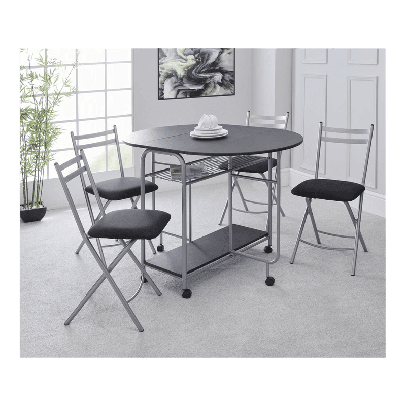 A smartly designed stowaway dining set for up to four people. The two tabletop end panels drop down and the four chairs fold and stack neatly under the table for a space saving footprint.
