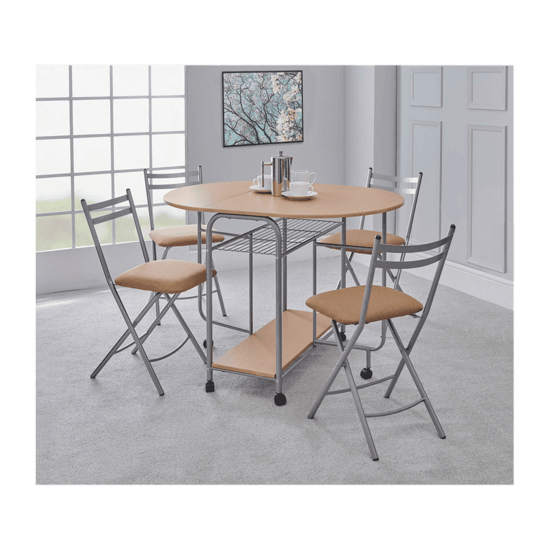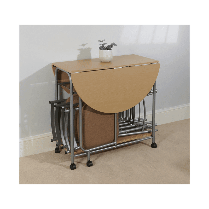 A smartly designed stowaway dining set for up to four people. The two tabletop end panels drop down and the four chairs fold and stack neatly under the table for a space saving footprint.