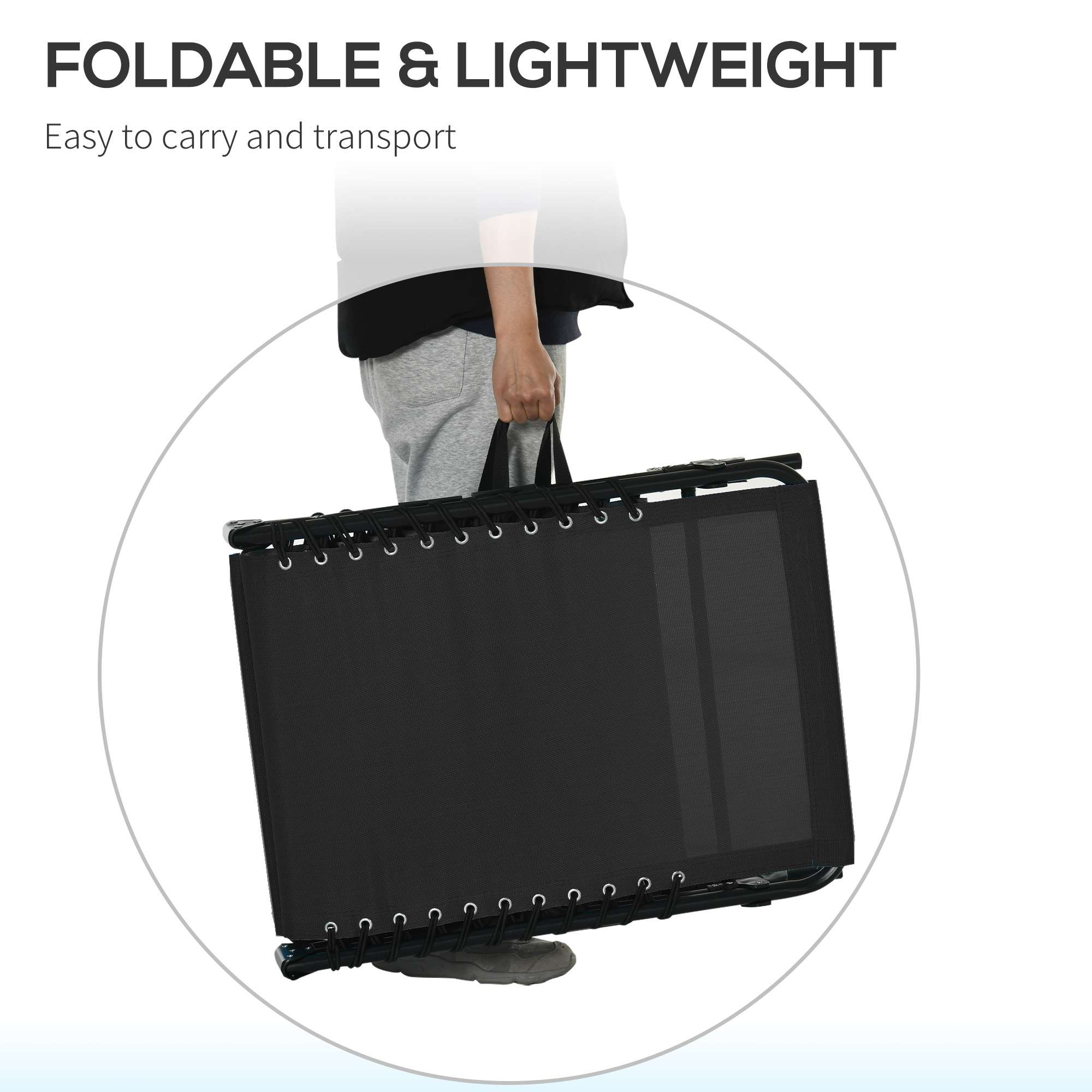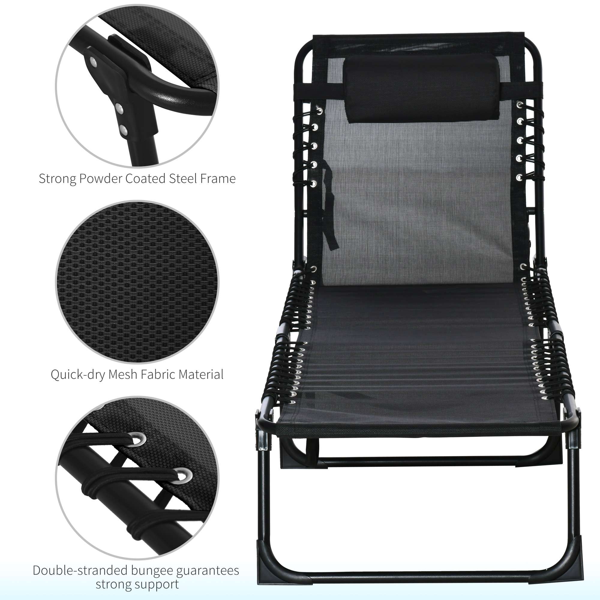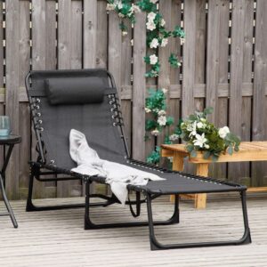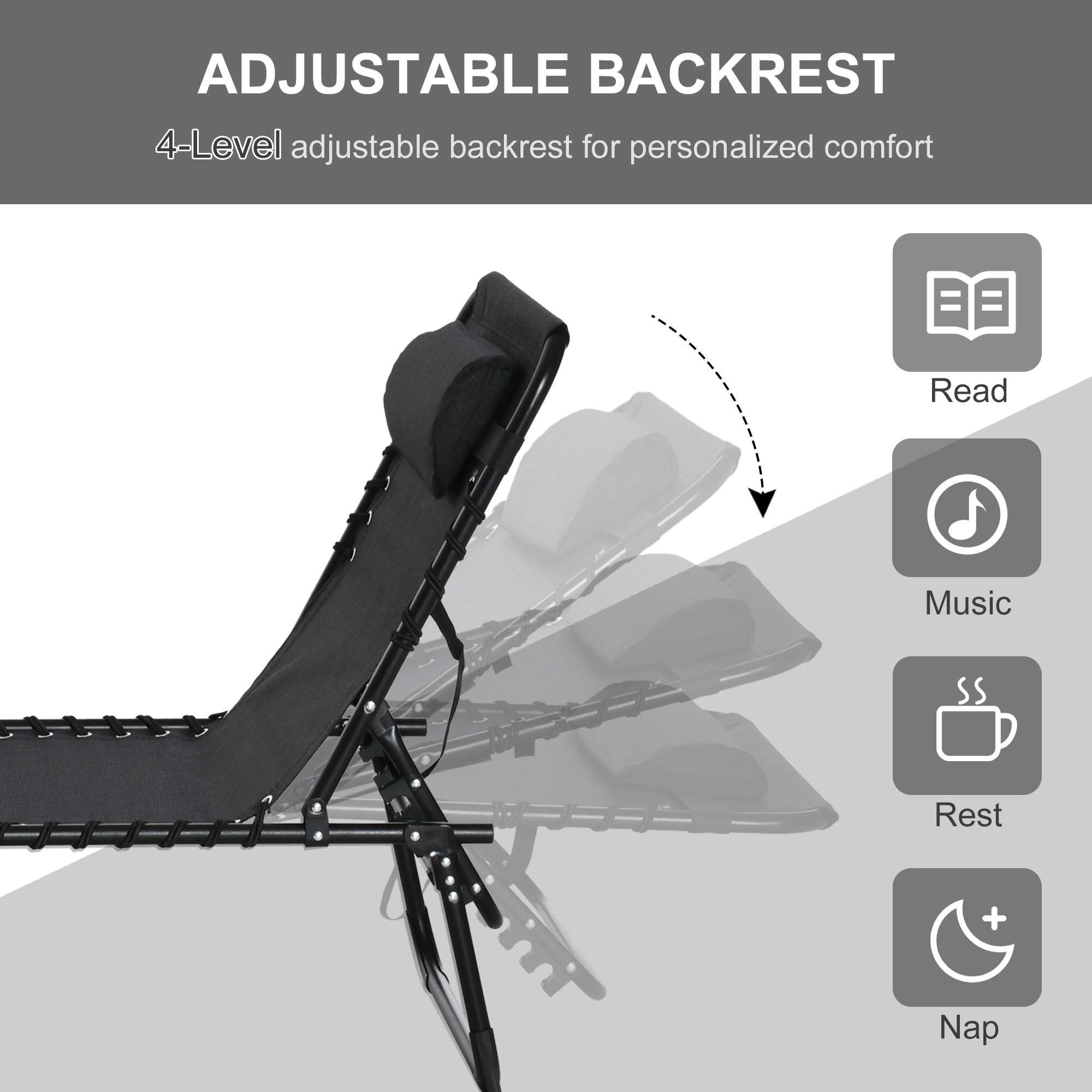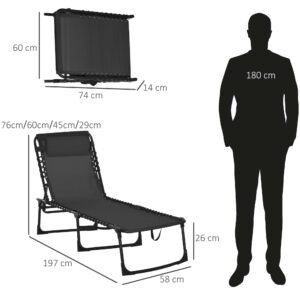 PRACTICAL GARDEN LOUNGE: The outdoor folding garden sun lounger is a perfect companion in a cool night, a leisurely afternoon or a decompressing vacation. ADJUSTABLE BACKREST: The backrest is 4-level adjustable and can meet your different needs, like read a book or have a nap. STABLE & COZY: The powder coated steel frame guarantees a stable standing and the 600D texteline with double elastic rope suspension system provides a comfortable yet strong support. FOLDABLE DESIGN: With the tri-fold design, the garden recliner is space saving when you store it in the corner or put it in the trunk in travel. DIMENSION: Overall Dimension: 197L x 58W x 78H cm, Folded Dimension: 74L x 14W x 60H cm.
