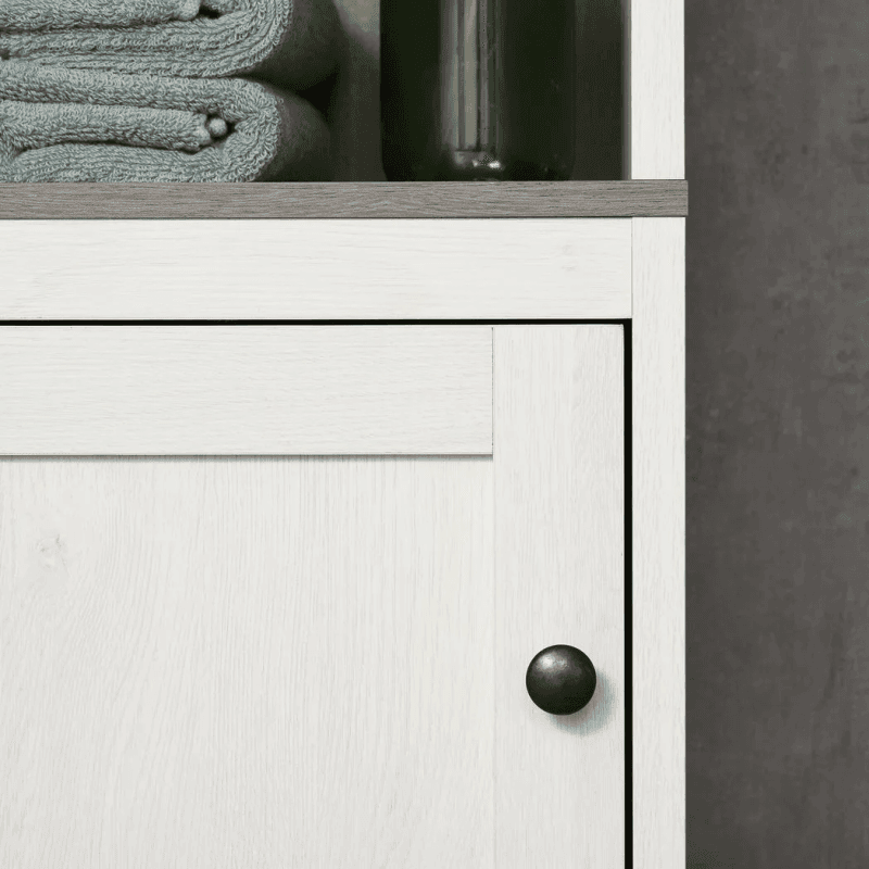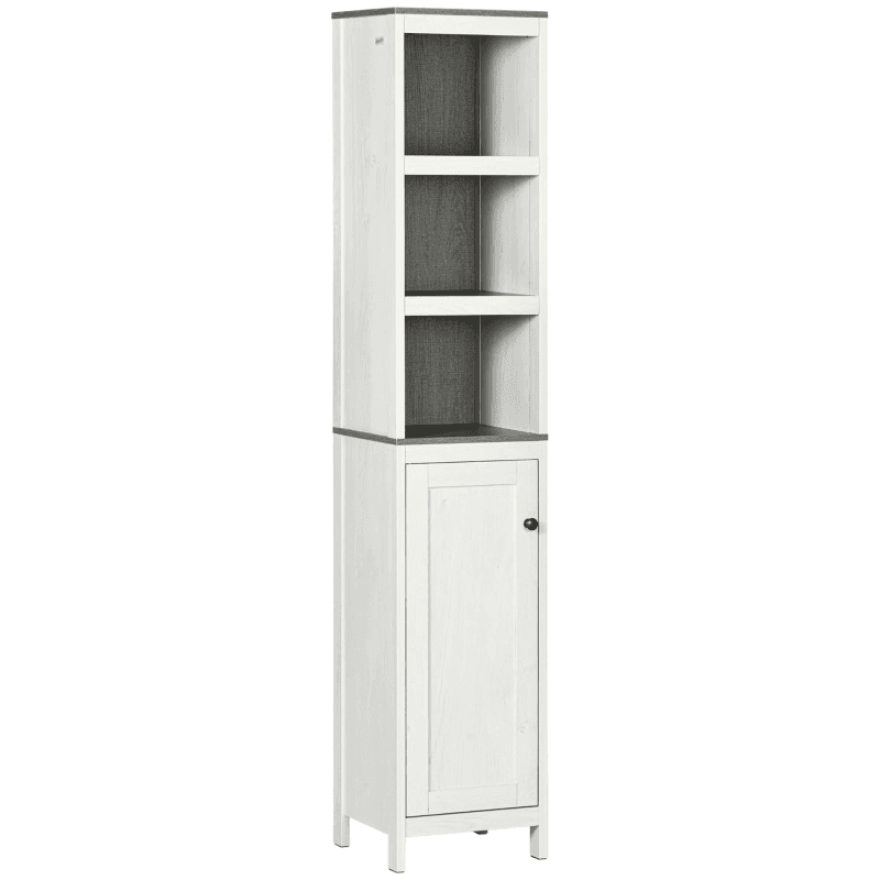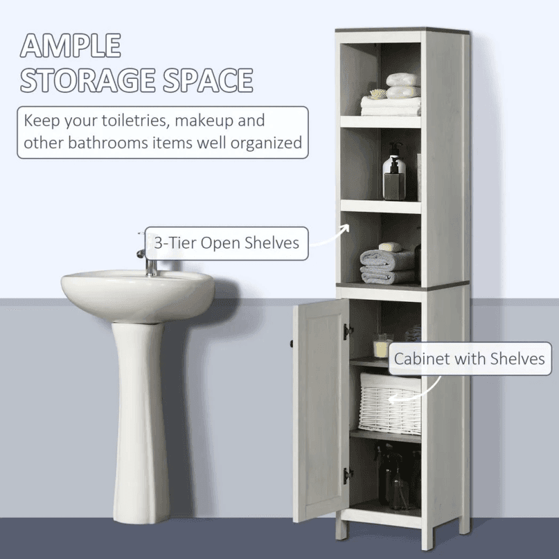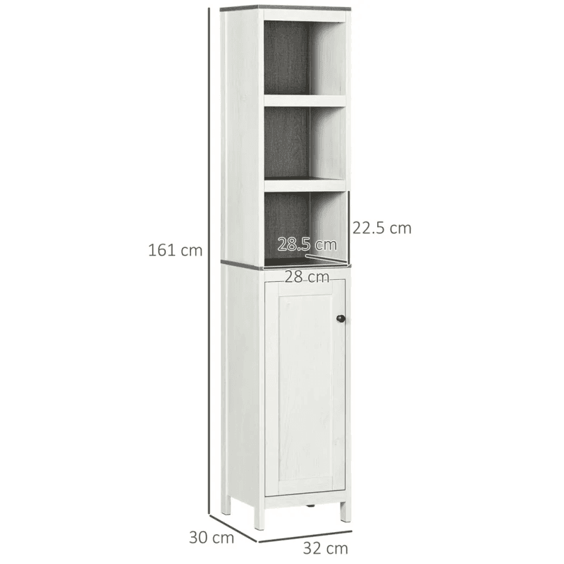 Storage: This tall bathroom cabinet features three top shelves and bottom shelf cupboard. Room for keeping your bathroom essentials and toiletries stored.