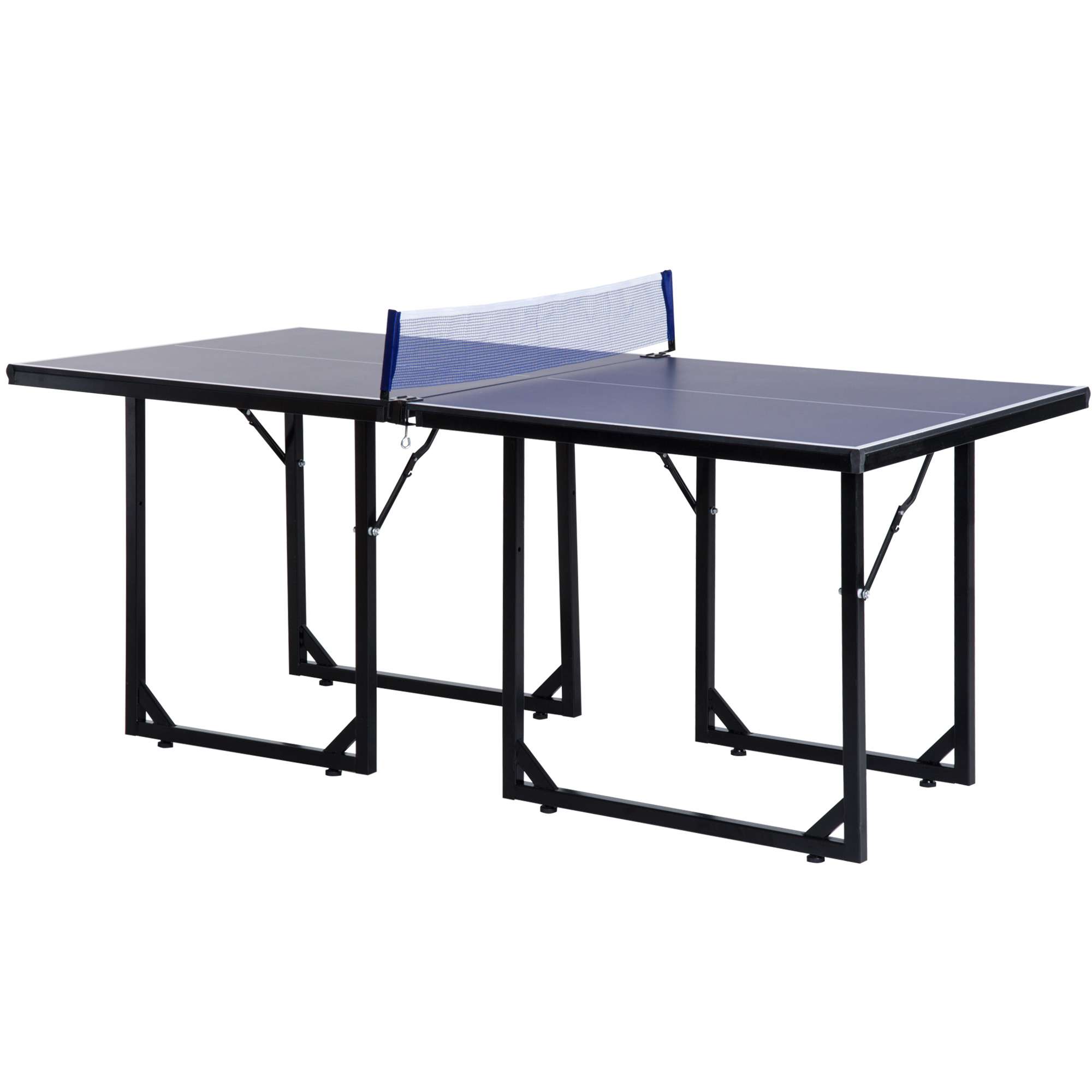 MULTI-USE: No assembly needed, ideal for small rooms, office entertainment or holiday outings. SPACE-SAVING DESIGN: Folding design, the legs can be fold in and place separate halves together each half separates for easy set up and storage. HIGH QUALITY CONSTRUCTION: Metal frame of the table provides durability and stability. READY TO PLAY: The table set come with a high-quality net rack and net are included as accessories, ready to play the sport. Overall Size: 182L x 91W x 76H cm