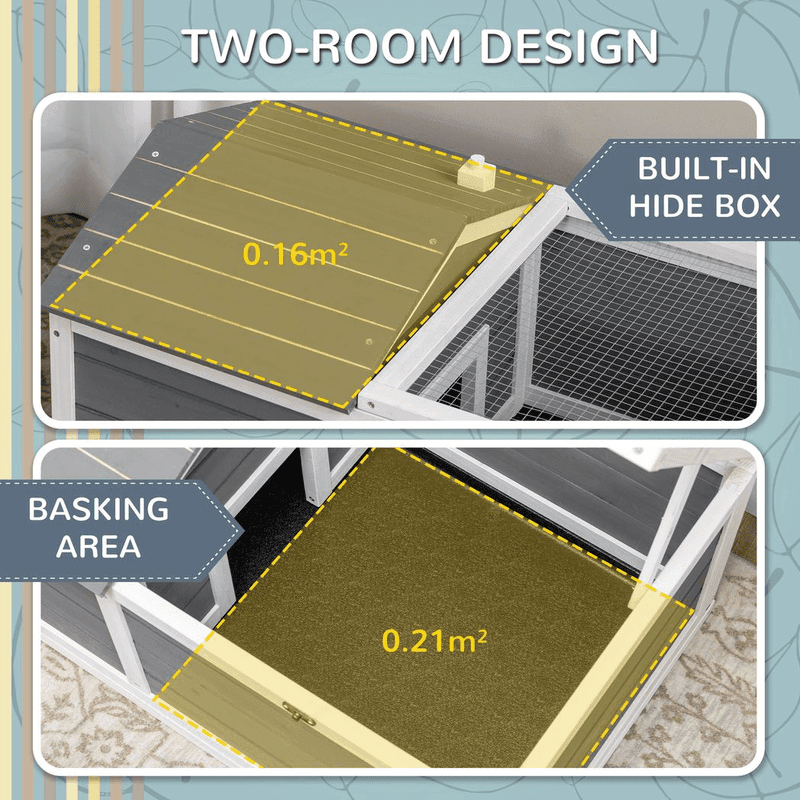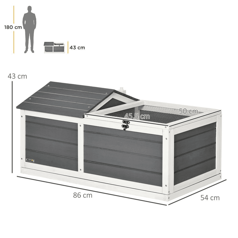 – Dimensions: 43H x 86L x 54Wcm. Main house: 38H x 34W x 46Dcm, area: 0.16m². Run cage: 29.5H x 45W x 46Dcm, area: 0.21m². Inner door: 16H x 16Wcm. Openable lid: 45.5W x 50Dcm. Plastic tray: 85L x 50Wcm