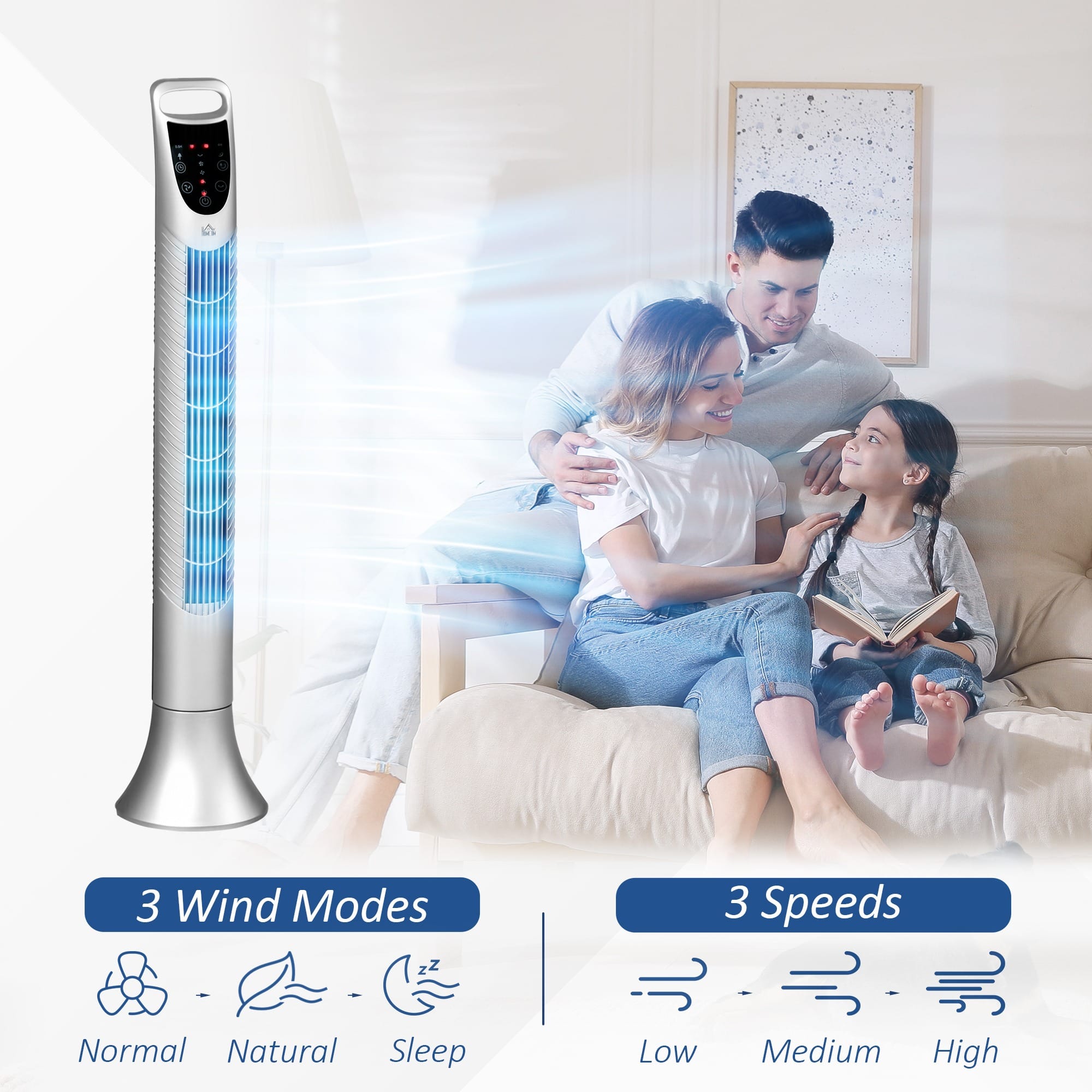 – Tower Fan, 3 Speed 3 Mode Timer Oscillation, Remote Silver Fan