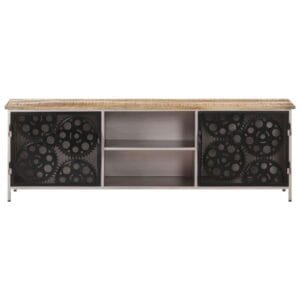 Introduce a touch of elegance and convenience to your interior décor with this trendy wooden TV cabinet! Made of rough mango wood and iron, this HiFi cabinet is durable and sturdy. You can place your TV, router, multimedia appliances, or display decorative items like photo frames, fruit baskets, or vases on the sturdy hardwood top. Equipped with 2 doors and 2 compartments, the TV unit offers ample storage space for various small items. Additionally, the doors are made of real bicycle chain wheels, which are stylish and unique. Important note: Colours and grains vary from piece to piece, making each piece unique. The delivery is random as well.