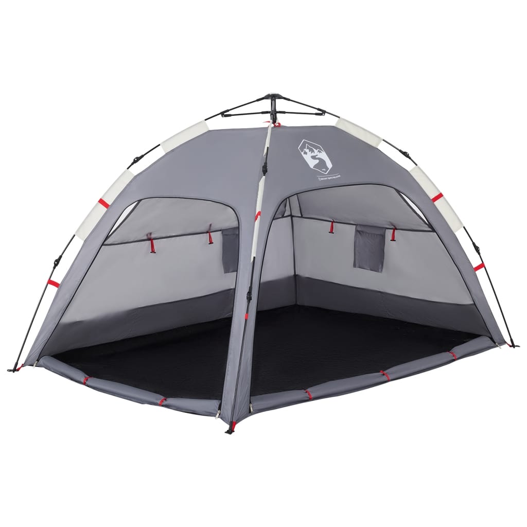 This beach tent offers you and your friends a cosy shelter in the hot summer or use it as a shade over the sandpit and paddling pool. Waterproof: This camping tent, made from polyester with a PU coating, is waterproof and wind resistant. Quick-release system: Set up the tent effortlessly with the quick-release system! Lay the tent down, extend the pre-assembled poles until they lock into place, and you’re all set! Dual-window design: The mesh window provides great ventilation and keeps insects out, while the waterproof window offers protection from wind and rain. Easy access: The zippered door allows for easy access. You can roll it up and secure it with the door toggles. It also promotes airflow and provides ample natural light. Stable and safe: Secure your tent firmly to the ground with the stakes and guy ropes provided to ensure stability and safety. Warning: Keep all flame and heat sources away from this product fabric.