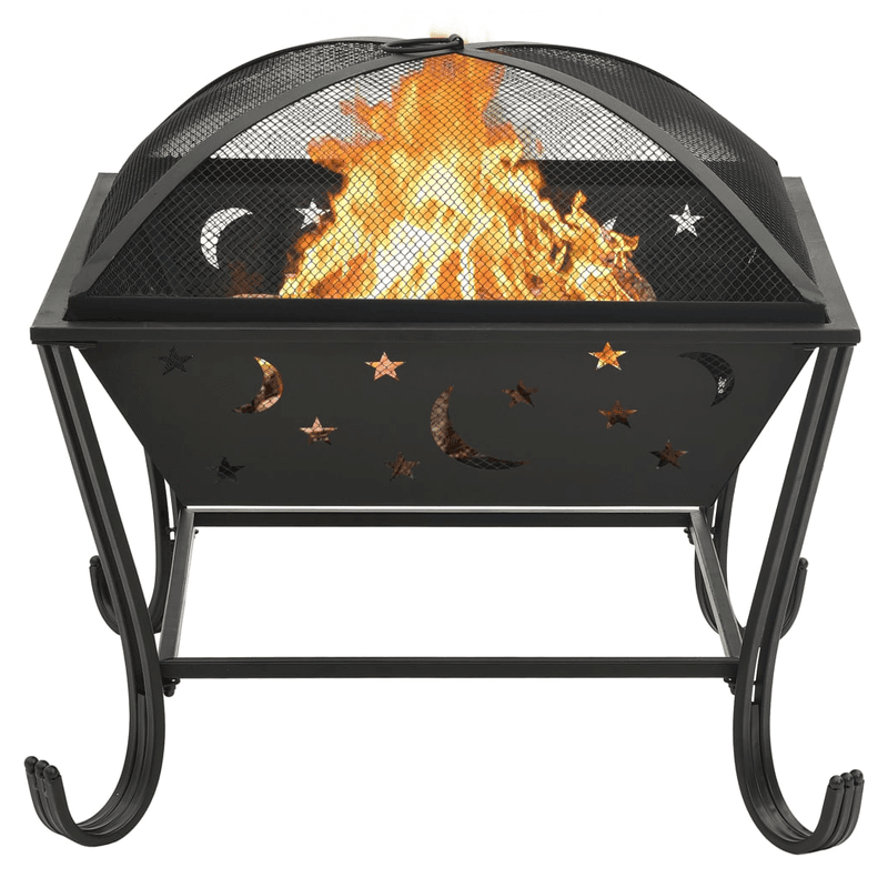 This fire pit will make a decorative and atmospheric addition to your garden or patio, while also keeping you warm when it gets colder in the evening. Made of steel, the fire pit is excellent in absorbing and radiating heat. Featuring a large and deep bowl, this fireplace allows for a large fire for you and your family to enjoy for hours. The mesh allows you to watch the burning fire, and encloses the fire for safety as well as preventing sparks and debris from flying out. Additionally, there is a convenient ring in the mesh cover so that you can carry it easily. The included metal poker can be used for both removing the mesh cover and rearranging the logs. Important notes: It can only be used outdoors. Do not touch the product when there is still burning wood inside or short after it.