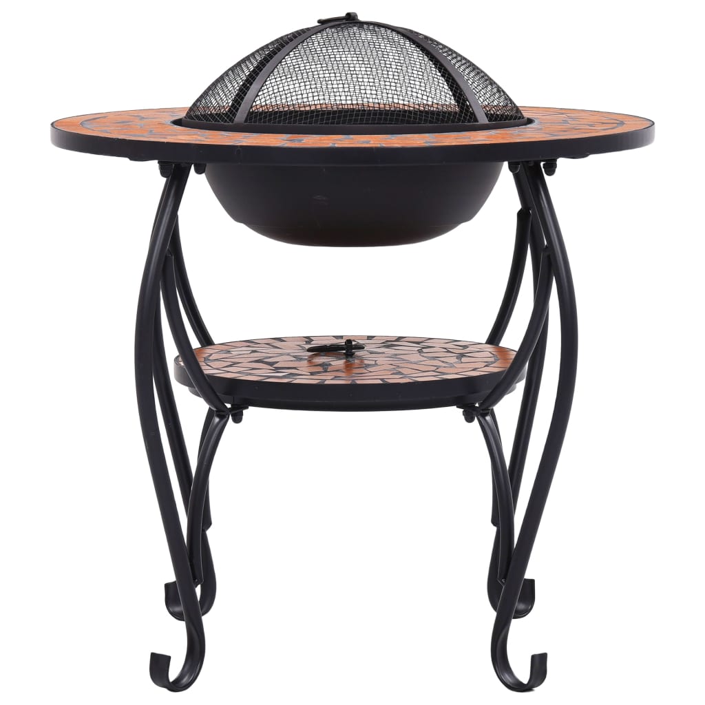 This fire pit will make a decorative and atmospheric addition to your garden or patio decor, while also keeping you warm when it gets colder in the evening. Made of steel, the fire pit bowl is excellent in absorbing and radiating heat. It can be used to burn dry wood, logs or charcoal. The fire pit is supported by a four-leg stand. The included safety mesh allows you to watch the burning fire, and encloses the fire for safety as well as preventing sparks and debris flying out. The poker tool can be used for both removing the mesh cover and rearranging the logs or coal. Additionally, the fire pit table can also be used as a barbecue. Its round ceramic surface offers a perfect place for drinks and roasting supplies. Please note this product is not suitable to be left outside in cold condition.