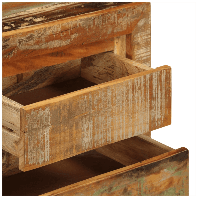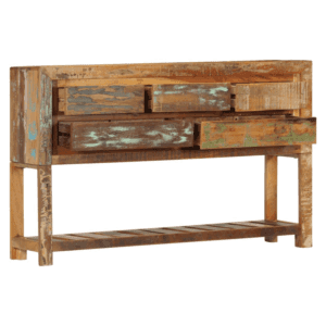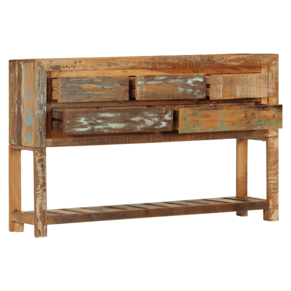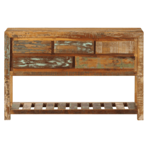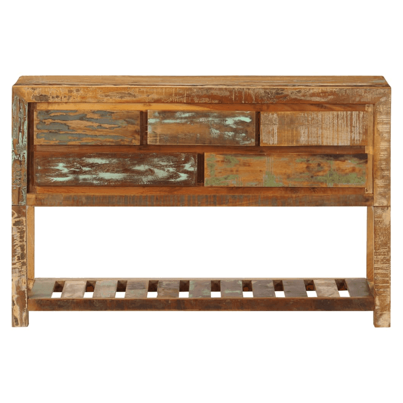 This wooden sideboard oozes a timeless charm that will make an eye-catching addition to your home décor. This console table is made of solid reclaimed wood that has been sourced from joists, floors and support beams from old buildings being demolished, and can consist of different types of wood like pine, teak, beech, oak, cedar, mango wood, acacia, etc. This means the reclaimed wood retains the characteristics of these different types of wood. Reclaimed wood is already aged, weathered and dried, so it doesn’t shrink or bend. The premium quality craftsmanship and elegant wood grains make every piece of hall table distinctive and slightly different from the next. This side table features 5 drawers and 1 shelf, providing commodious storage space for your clothing, books, as well as various other items. Important note: The colours and wood grain may vary from piece to piece, making each dresser unique; the delivery is random.