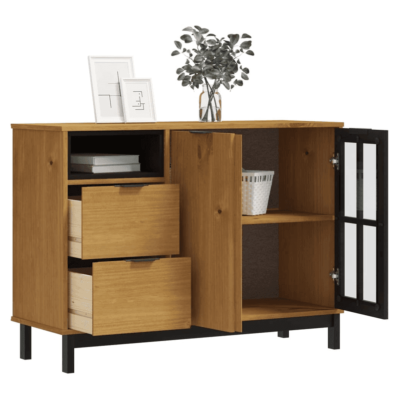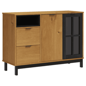 This wooden sideboard, featuring a timeless look, is meant to be an excellent addition to your home. Solid pine wood: Solid pine wood is a beautiful natural material. Pine wood has a straight grain, and the knots give the material its signature, rustic look. Made of solid pine wood, the storage cabinet is durable and sturdy. Ample storage space: The cupboard offers ample storage space for keeping your various daily essentials well-organised and within easy reach. Displaying function: The top of the storage cabinet is great for displaying your decorative items, photo albums or small plants. Warning: To prevent it being overturned, this product must be used with the provided wall attachment device.