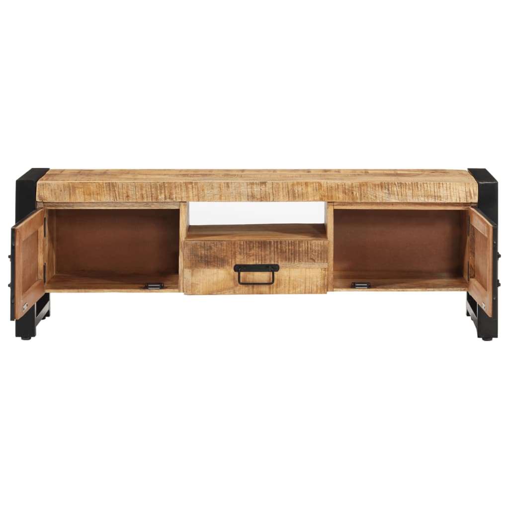 This classic wooden TV cabinet, featuring a unique design, instantly adds a touch of industrial style to your current living space. Solid mango wood: This TV stand is made of solid mango wood, a hardwood with dense grains. Solid mango wood not only has the strength to bear the weight but also stands the wear and tear of time. Powder-coated iron: The iron with the black powder coating finish of the TV unit provides extra stability. Spacious storage: This media cabinet features three compartments and a drawer, providing ample storage space for keeping your essential items organised and within reach. Practical doors: Keep your space clutter-free by hiding small essentials behind the doors of this media unit. Note: The colours may vary from piece to piece, making each piece unique and slightly different from the next. The delivery is random. Each product comes with an assembly manual in the box for easy assembly.