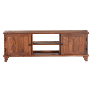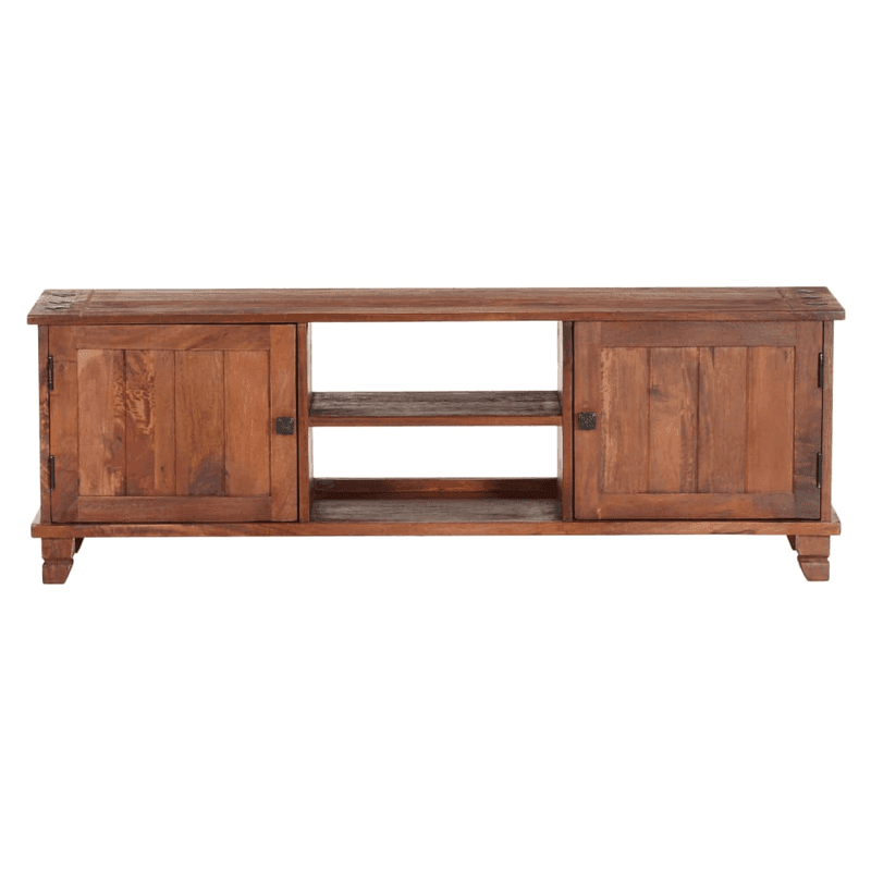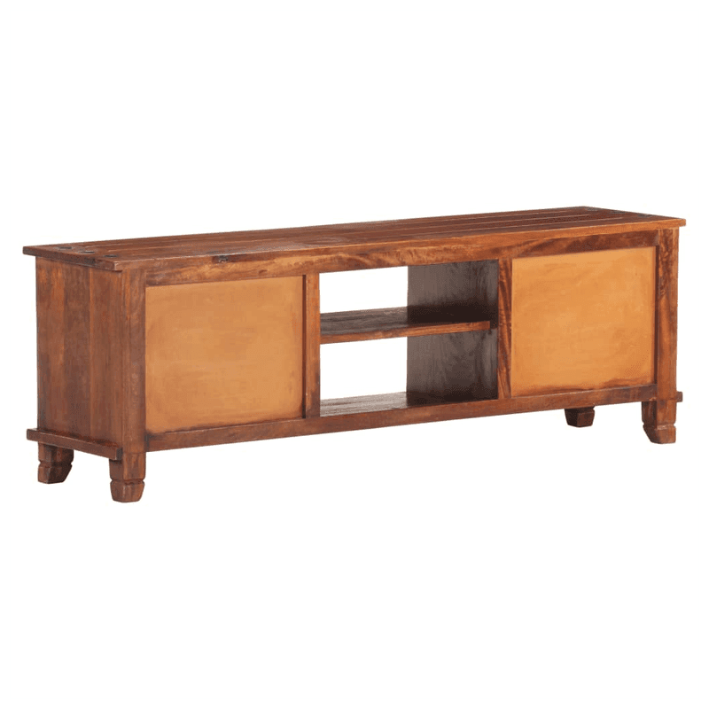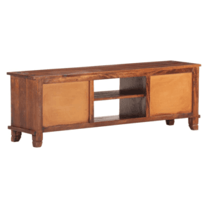 This wooden TV cabinet featuring ample storage space is meant to be the focal point of your living room or entertainment area. This stereo cabinet is made of solid acacia wood, a hardwood with dense grains. This beautifully-designed TV stand is stable, durable and eye-catching. Additionally, the exquisite craftsmanship and beautiful wood grains make every piece slightly different from the next. The storage cabinet features two doors and two open compartments, providing ample storage space to keep your DVDs, multimedia appliances, books and small essential items organised and within reach. Important note: The colours vary from piece to piece, making each piece unique. The delivery is random, ensuring the exclusivity and individuality of your product.