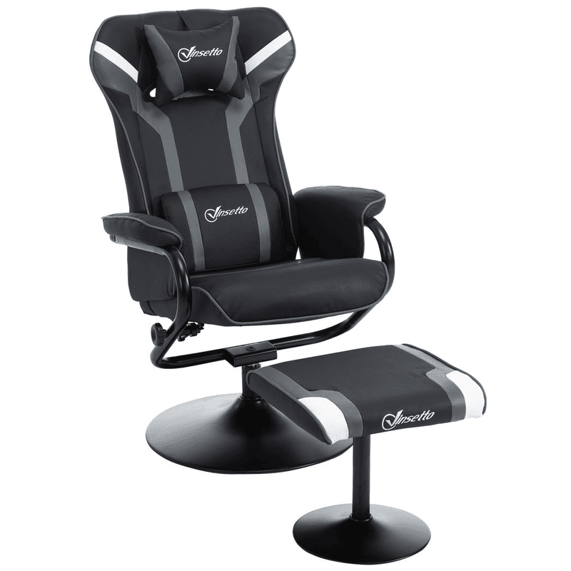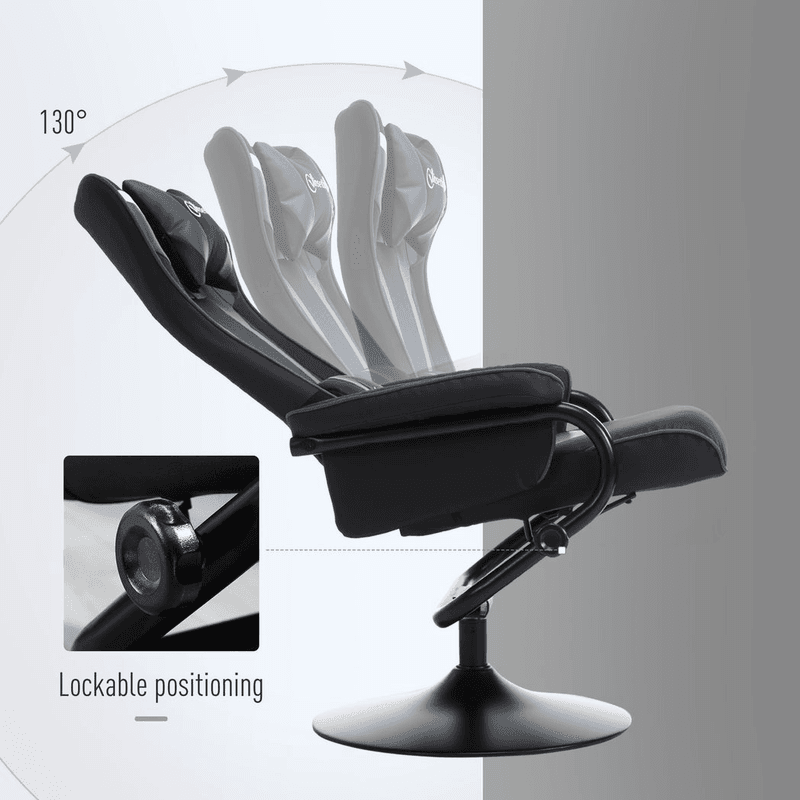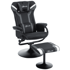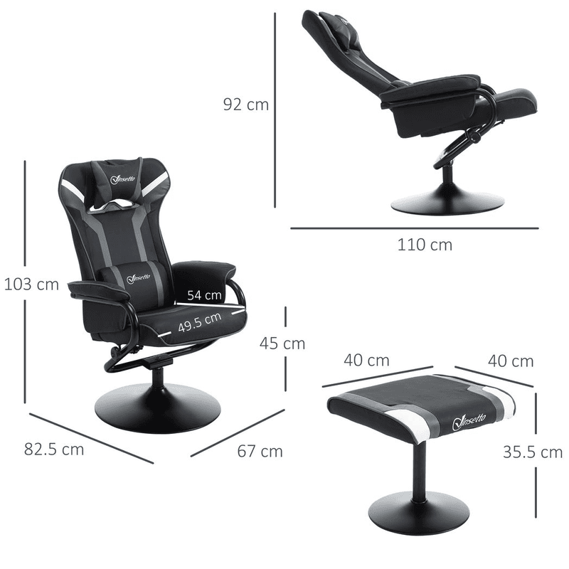 – Description: DUO SET: Formed of the racing-style recliner chair and footstool, giving you a place to sit and relax when wanted. Perfect for gaming rooms, bedrooms, and personal workspaces. ERGONOMIC SWIVEL RECLINER CHAIR: Features a 130-degree reclining back, large swivelling seat, fixed arms, and a round steel base and frame to keep the recliner armchair centred and balanced. PU LEATHER UPHOLSTERY: Cool racing-stripe design that is smooth to the touch and easy to clean. COMFORTABLE: Filled with thick sponge and equipped with a removable back and head pillow. MATCHING FOOTSTOOL: Provides a place to elevate your legs and feet.”