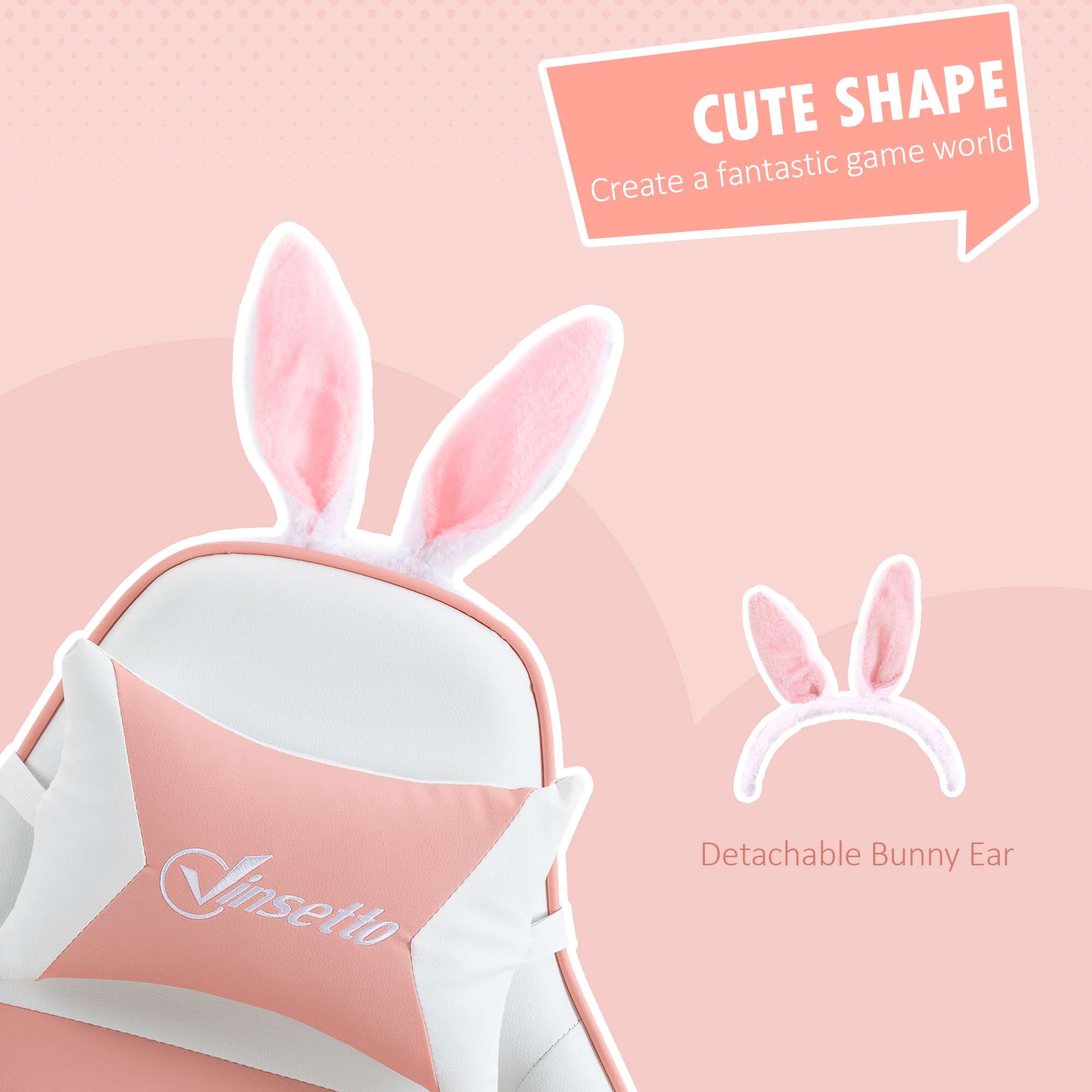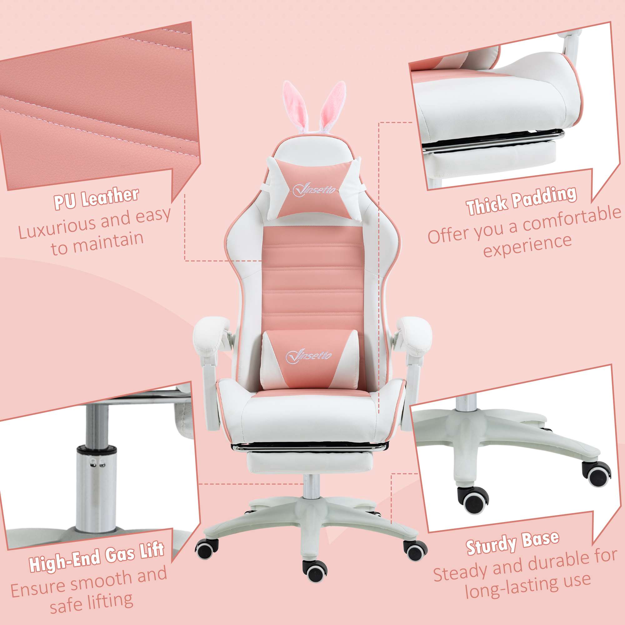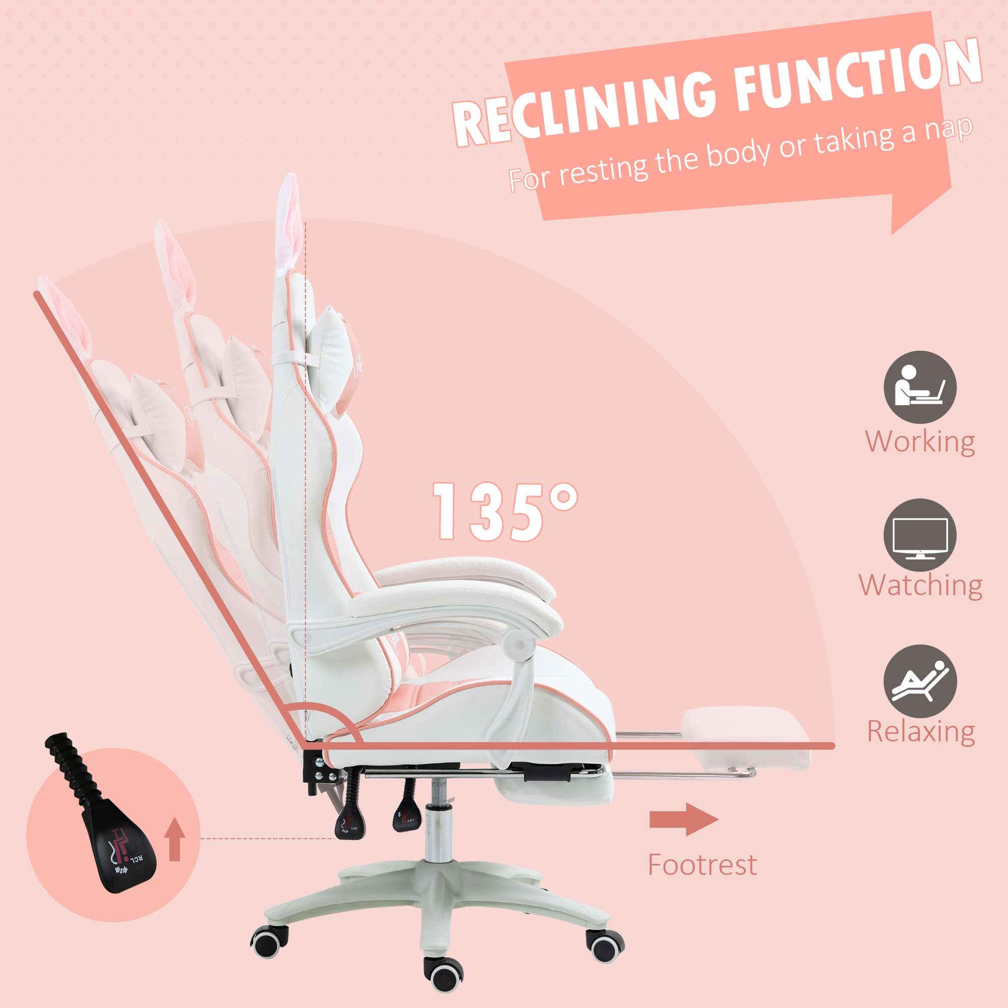 Cute gaming chair: Something different for your home office space, this game chair comes with fluffy bunny ears on top.135e reclining back and footrest: Lean back to a position you want and elevate the lower body separately. Keep yourself relaxed whilst playing in this gamer chair. Padded, with faux leather upholstery: Sit and game in comfort in this computer chair. PU leather in a colour block design is striking and stylish.44-52cm adjustable height: Set the position of this PC chair to a level you want. Suitable for using at different heights. Dimensions: 136-142H x 65W x 63Dcm. Seat: 44-52H x 50W x 48Dcm. Maximum load 120kg. Assembly required.