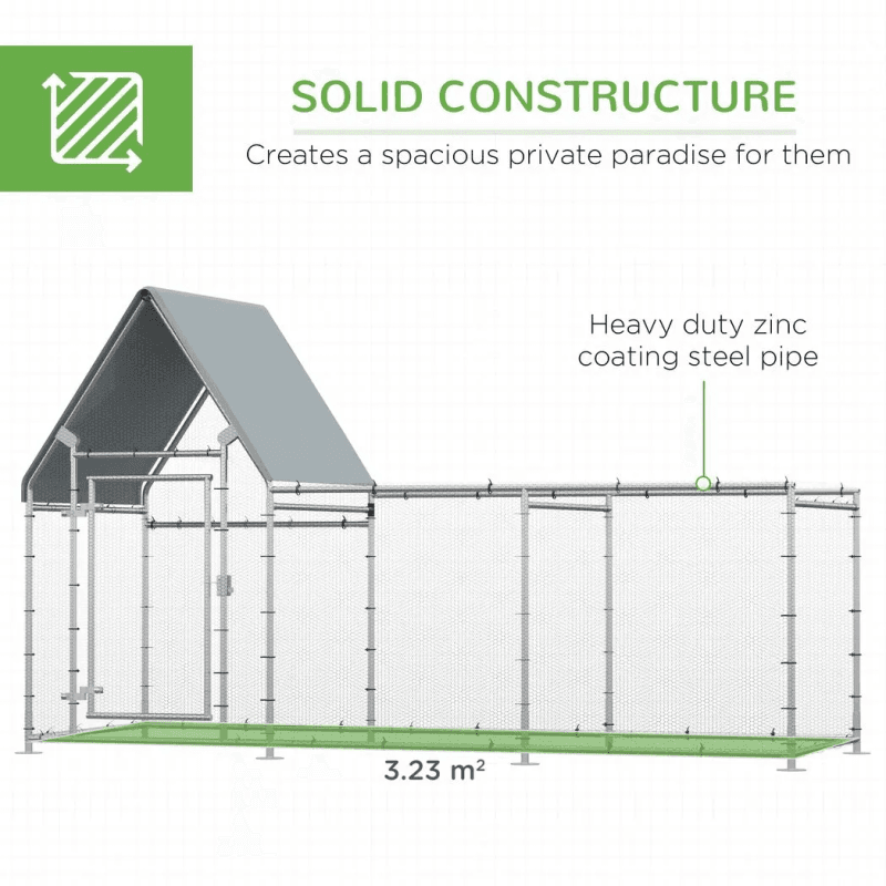 – Dimensions: Height: 172cm, Length: 302cm, Width: 107cm. Eave measures 100cm. Can accommodate 6-8 chickens.