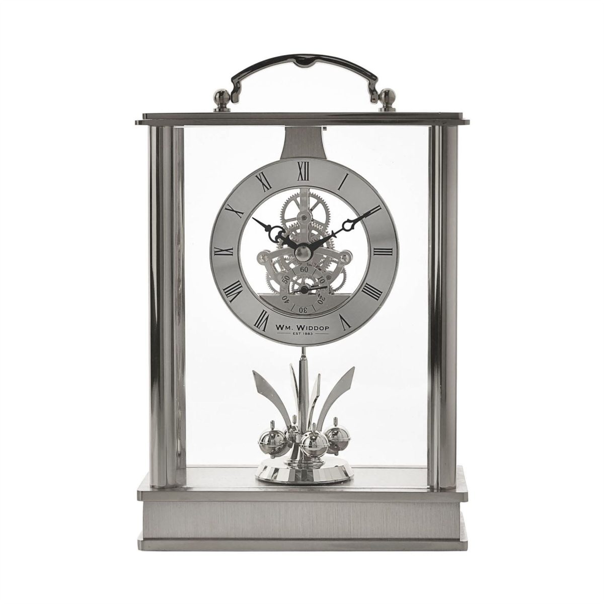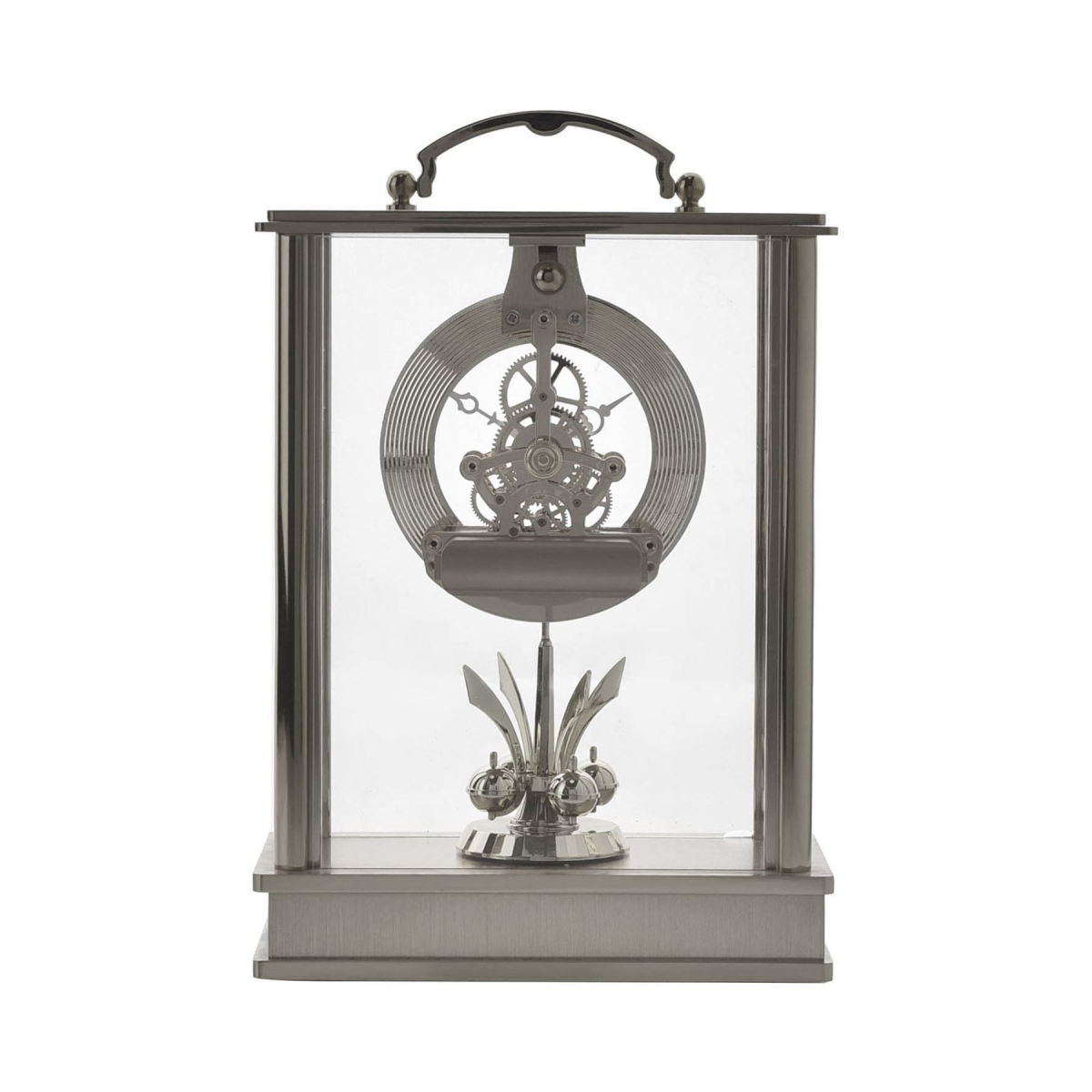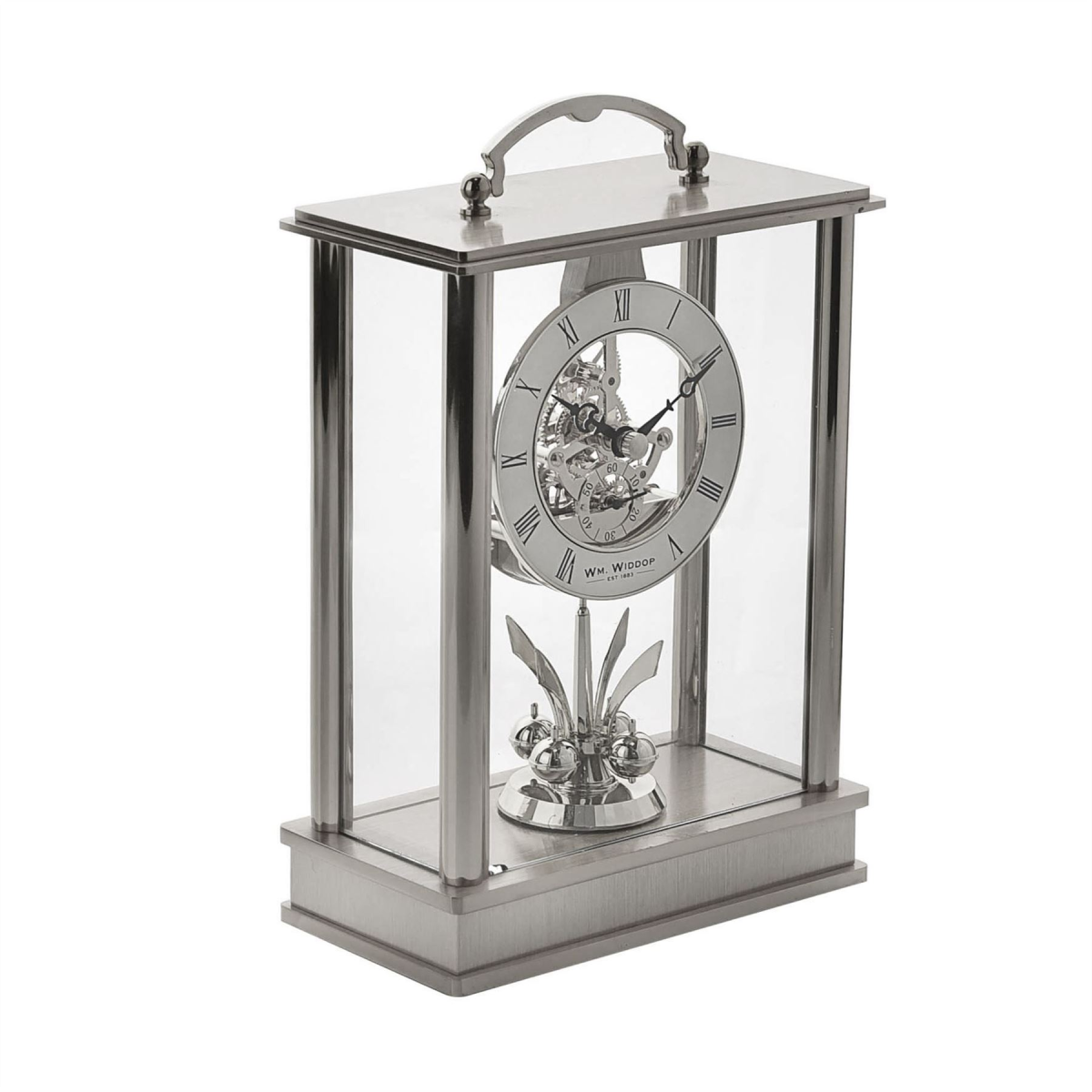 The glistening appearance showcases the clock’s beautiful design, intricate detailing and rotating pendulum, located below the clock face. The clock is encased within glass panels, completed by a floating Roman dial, decorative clock hands and skeleton movement.