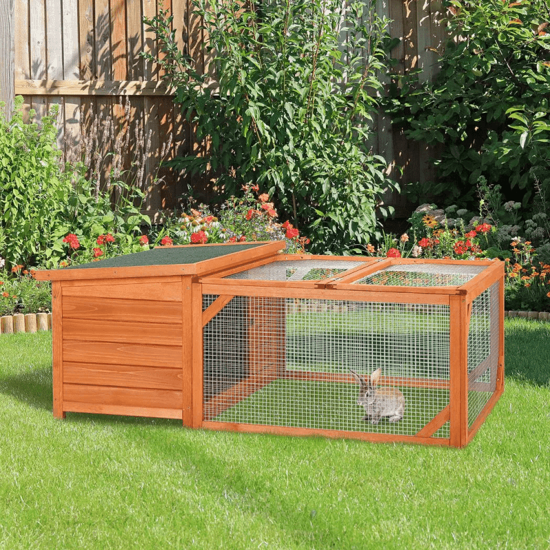 WEATHER RESISTANT: This outdoor rabbit hutch is made of durable weather-resistant fir wood and a water-resistant composite asphalt roof with its off ground design this rabbit hutch will keep their home dry and clean.